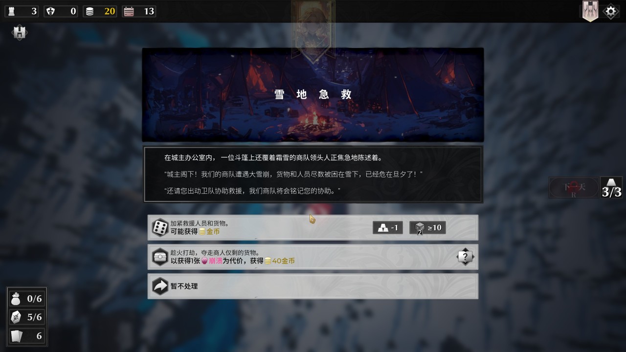 在凛冬和怪物进攻中,坚守13天(对应13个回合)。当面对被困的商队,趁火打劫夺走商人所有物资还是伸出援手,搏一个可能的回报呢?贪婪、崩溃、诅咒......,这些负面卡牌会着恶行进入我们的卡组。