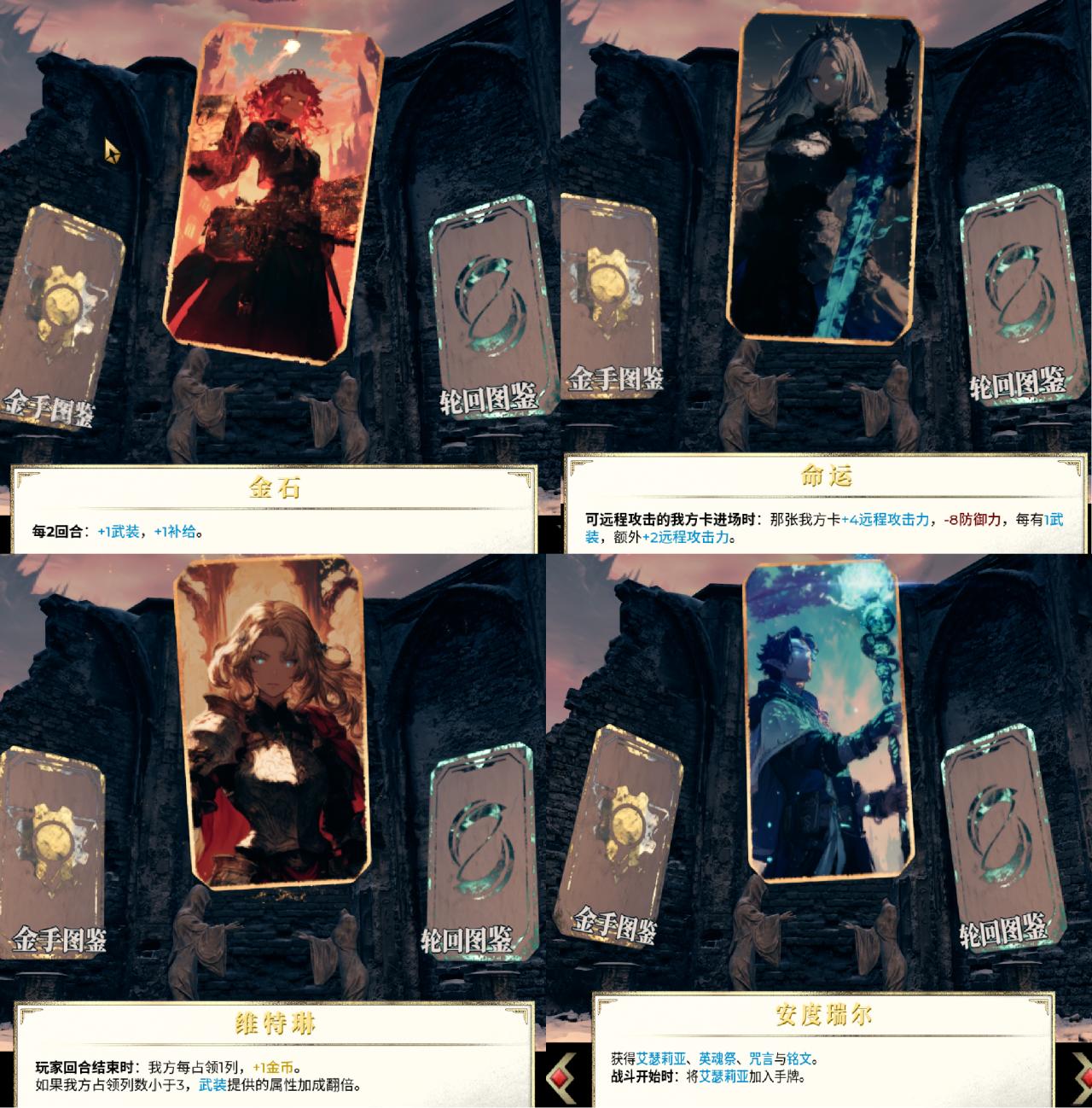 强权偏进攻+杀戮,花式杀死囚;金手围绕金币获得/花费,注重经济;轮回偏防御,靠着空无反伤;公理考研操作理解,需要依靠技能卡。除了四大派系的基础卡牌外,在游戏里完成特定挑战后解锁额外支援卡组(32种额外支援卡组,支援牌可选择开启,避免污染卡池)。