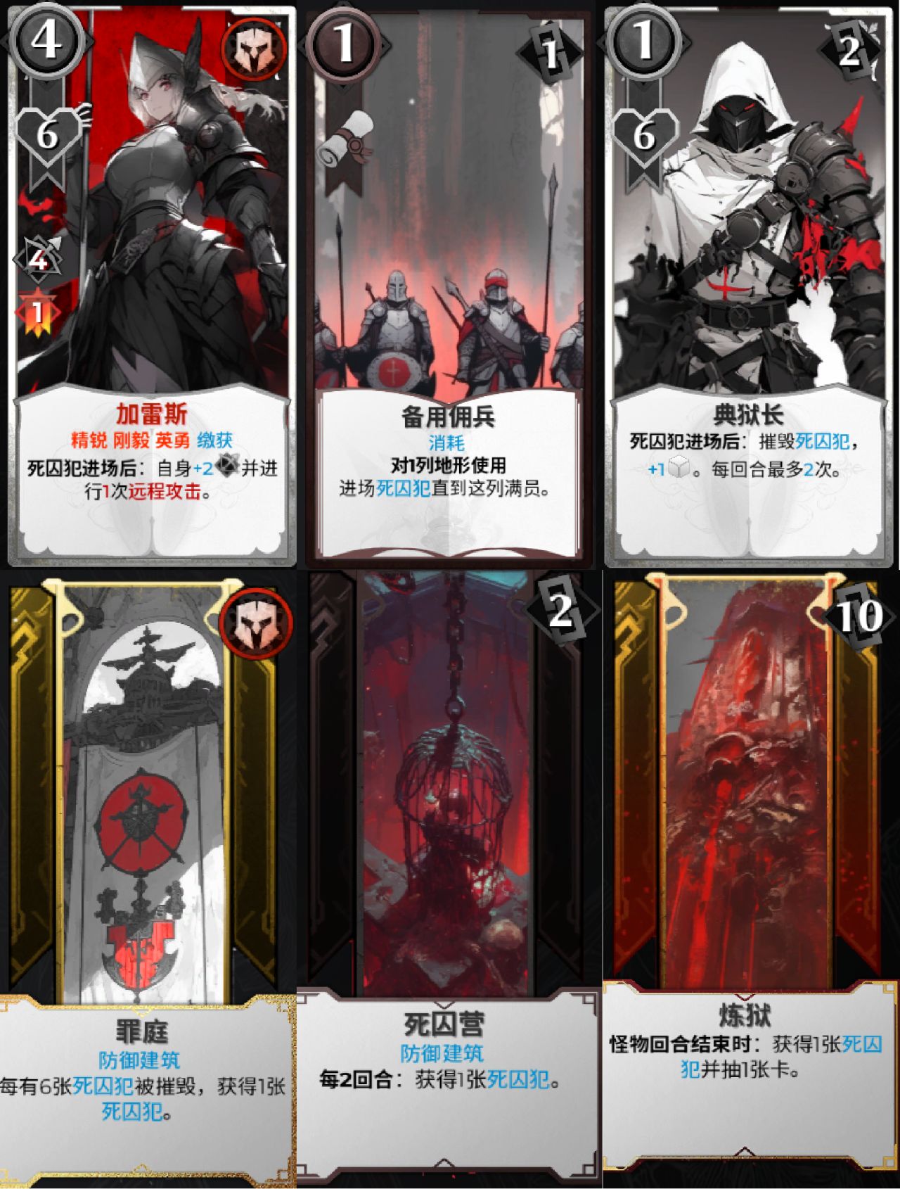 以加雷斯+死囚流为例,死囚是生命值为4的炮灰牌,一回合自动销毁。死囚进场能够增加加雷斯2点攻击力并触发一次远程攻击。加雷斯击杀怪物后,获得一张死囚牌(缴纳效果)。备用佣兵使单列满死囚,+10点攻击并出发5次攻击。典狱长杀囚加补给,很牢很刑。