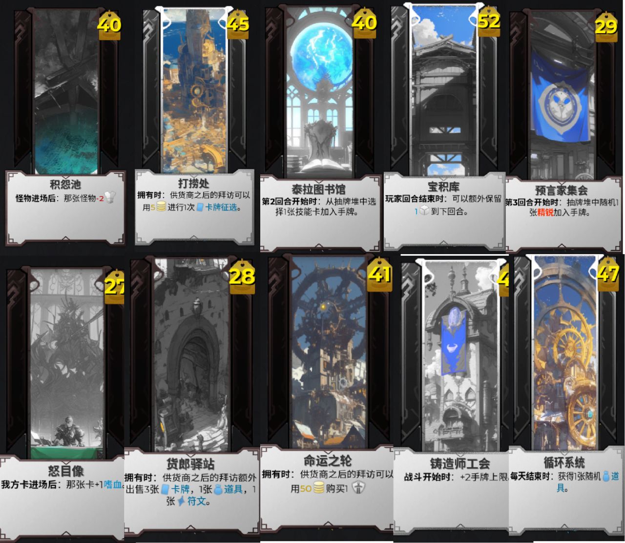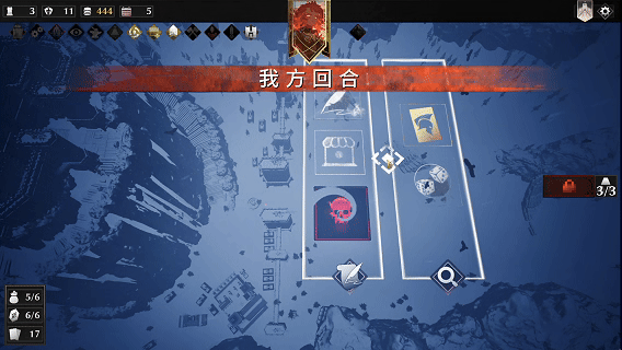 城市共有3点完整度,相当于三条命。城市建筑提供额外的加成,尤其是命运之轮:每回合购买1点武装、宝积库:保留补给至下回合、怒目像:卡牌+1嗜血、循环系统:每天随机获得道具牌。
