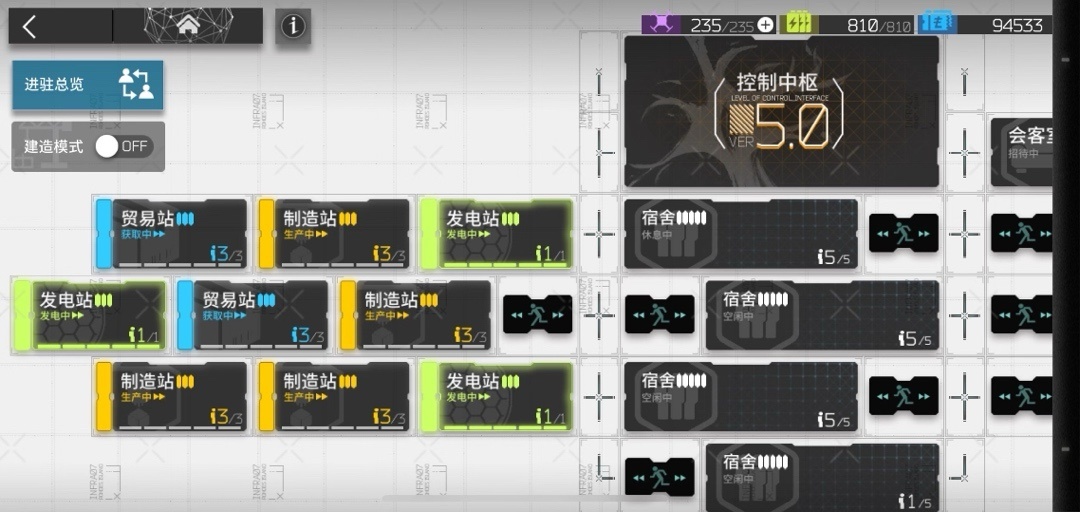 • 解锁「干员宿舍」(恢复心情)、「训练室」(技能专精)、「会客室」(获取线索后获得信用可在采购中心购买物品以及获得干员)
