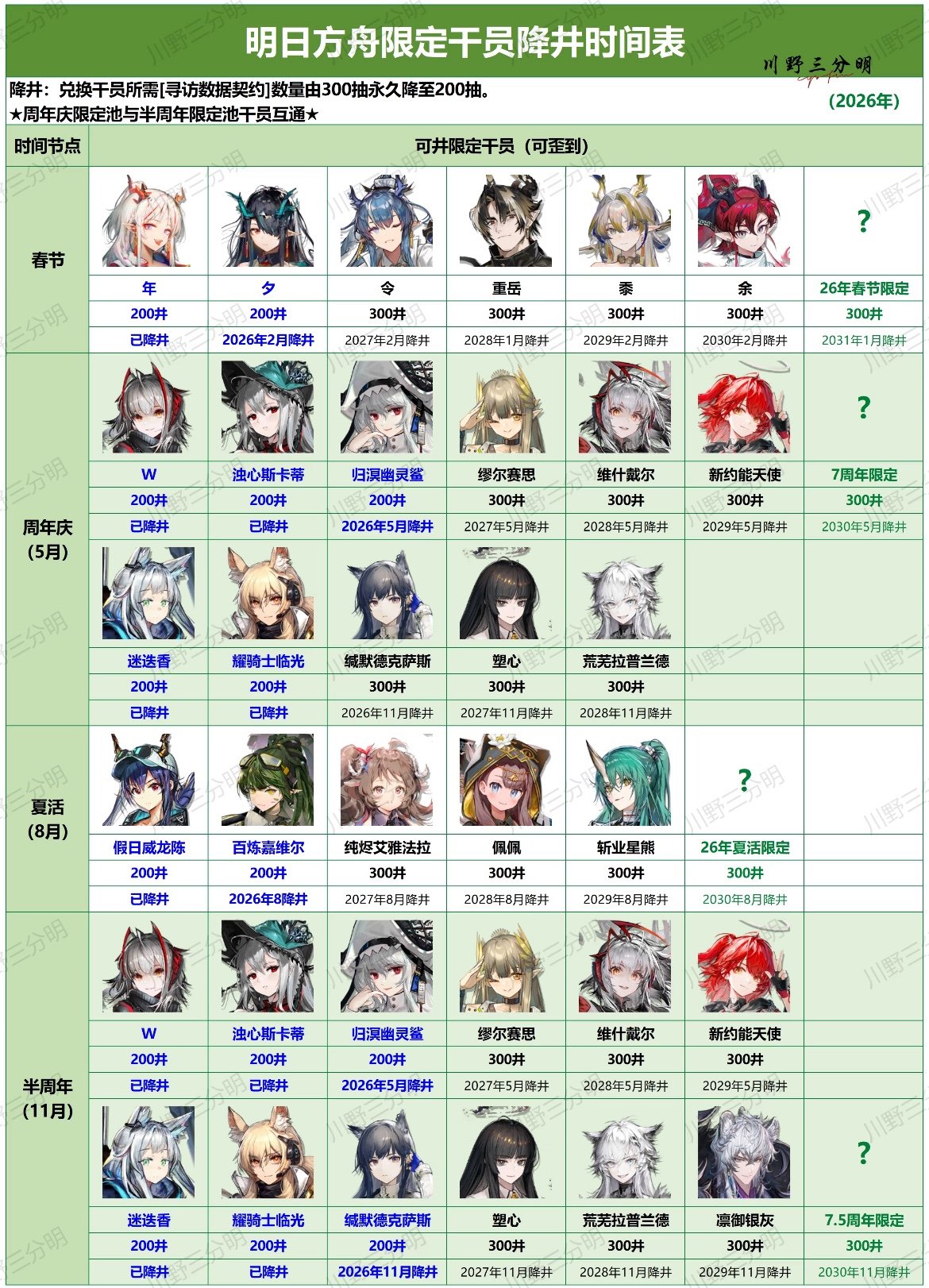 抽卡资源规划:遇到强势干员或自己喜欢的普通卡池(活动池)可以下到六十左右的抽数拿个小保底,没抽到建议跑路备战限定池,建议萌新不浪费抽数去抽中坚卡池,除非有中坚寻访凭证,限定池个人建议是必抽的卡池,首先300抽必得当期限定,300抽俗称一井,可以换取往期出现在兑换商店中的限定干员,部分往期会降井,联动卡池则基本只需要120抽(注意,限定卡池分为三个类别,分别是新年卡池,周年庆卡池,夏活卡池,联动卡池)