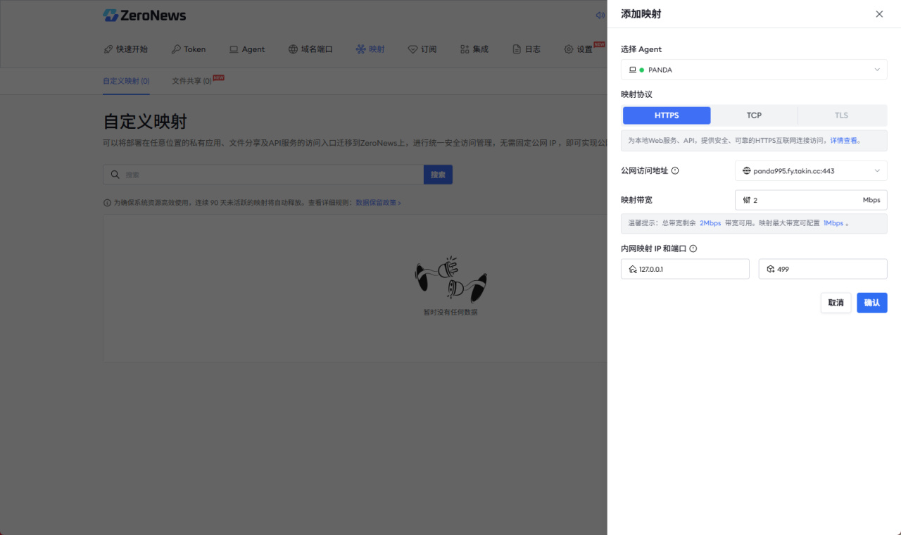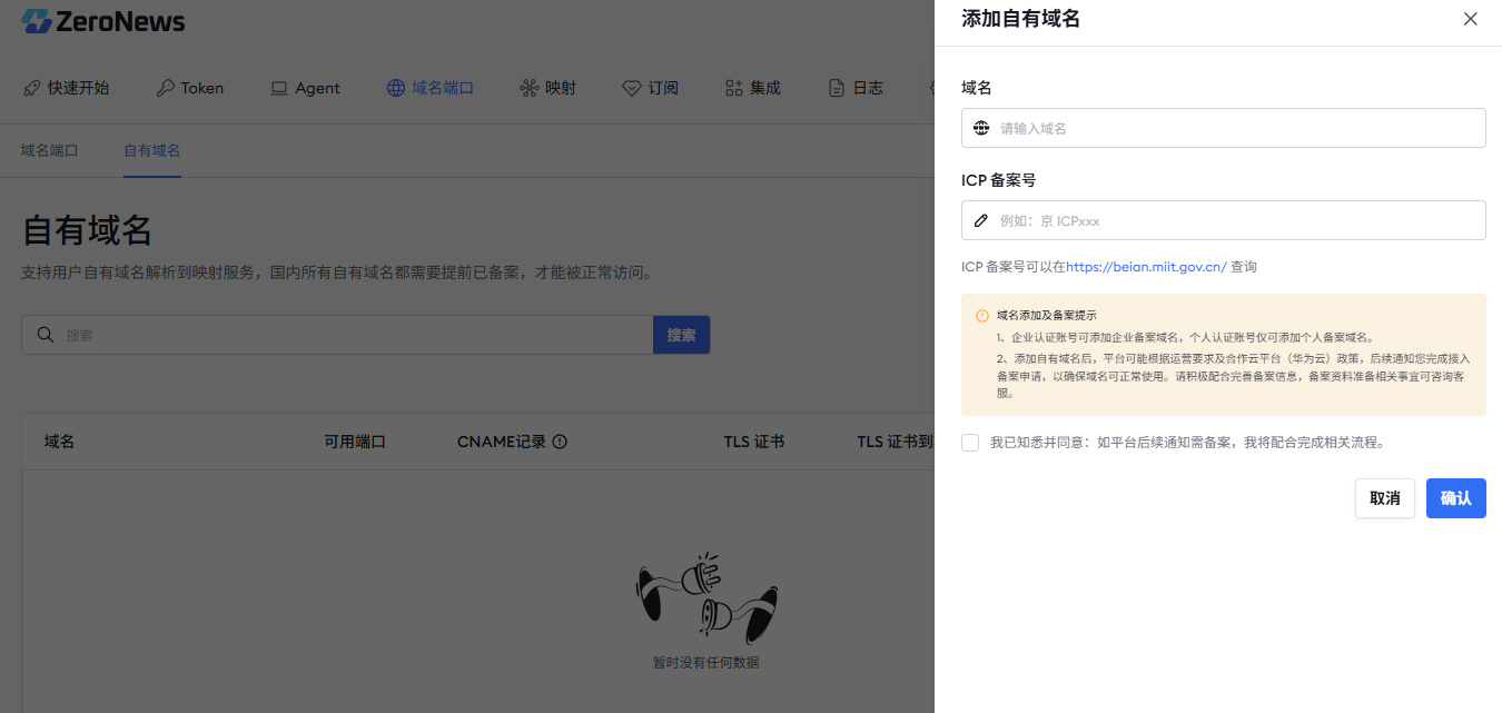 除了 ZeroNews 提供的域名,如果你有自有域名也可以直接用自由域名进行映射,毕竟自有域名作为一级域名还是更好记一点,不过域名一定要进行备案。