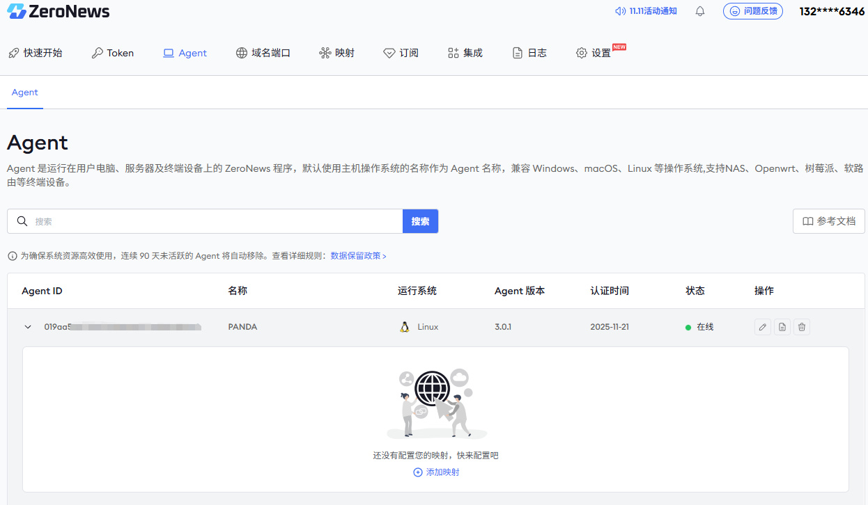 回到 ZeroNews 的控制台,在 Agent 界面,就能看到咱们绑定的设备已经在线了。点开之后,就能对它进行映射配置。