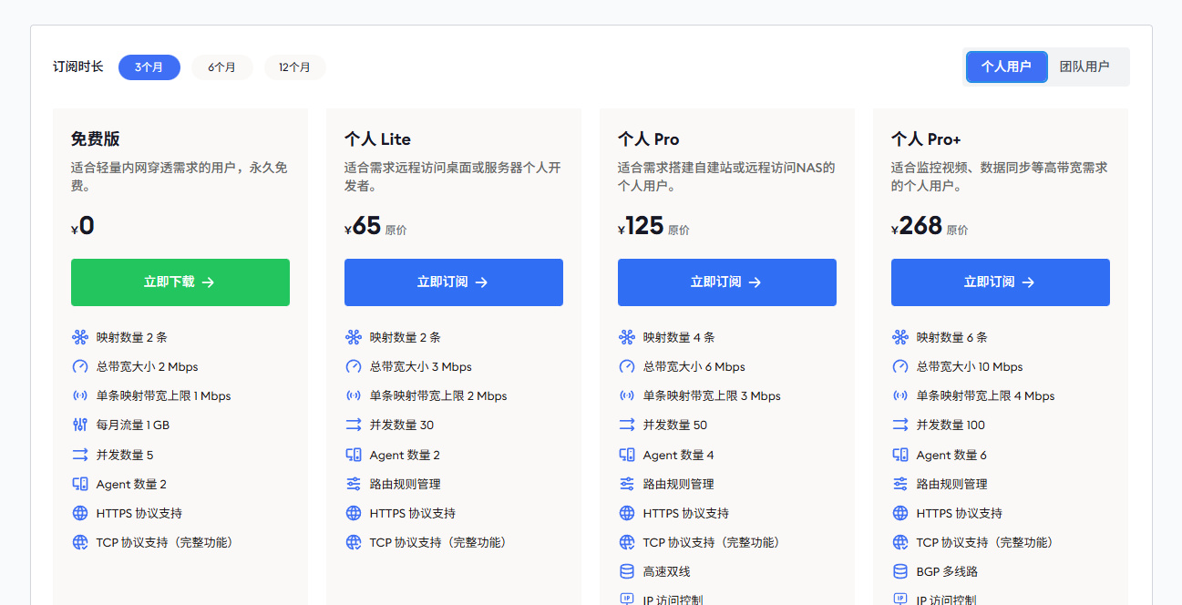 要是觉得免费的不够用,ZeroNews 有多种资费订阅可选。它最大支持 6 条映射,总带宽达到 10Mbps,如果你是团队需求,那么 ZeroNews 能提供最大 15 条映射以及 20Mbps 的带宽,而且功能也更丰富,像 BGP 多线路、IP 访问控制、鉴权认证,还有自由域名这些,按照自己的需求付费就行。