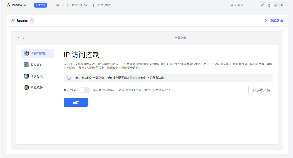 个人用户还有一点非常头疼,就是当你将内部的端口开放并解析到域名之后,难免会有一些陌生的IP进行访问,我相信大部分人都经历过 NAS 被各种海外 IP 访问的情况。ZeroNews 提供了 IP 访问控制、鉴权认证以及路由管理等等措施,你可以通过它来严格控制访问的 IP,实现更为安全的映射资源访问。