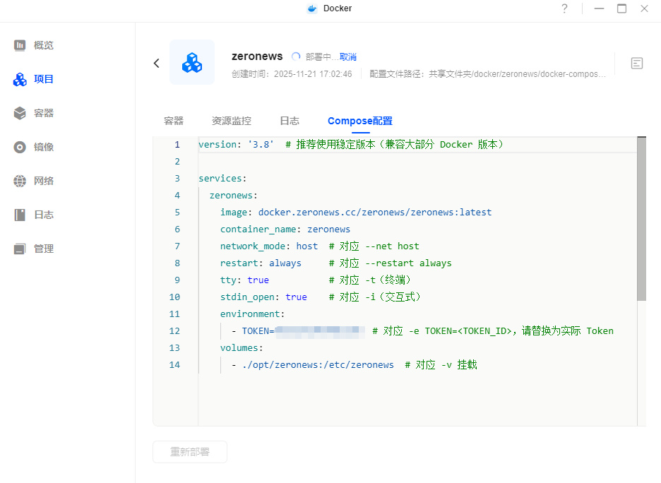 部署方面,这里熊猫以绿联的NAS为例,毕竟官方貌似没有对应的绿联NAS部署过程。我们打开绿联的Docker,在项目中新建输入以下代码,其中的TOKEN记得替换成自己的: