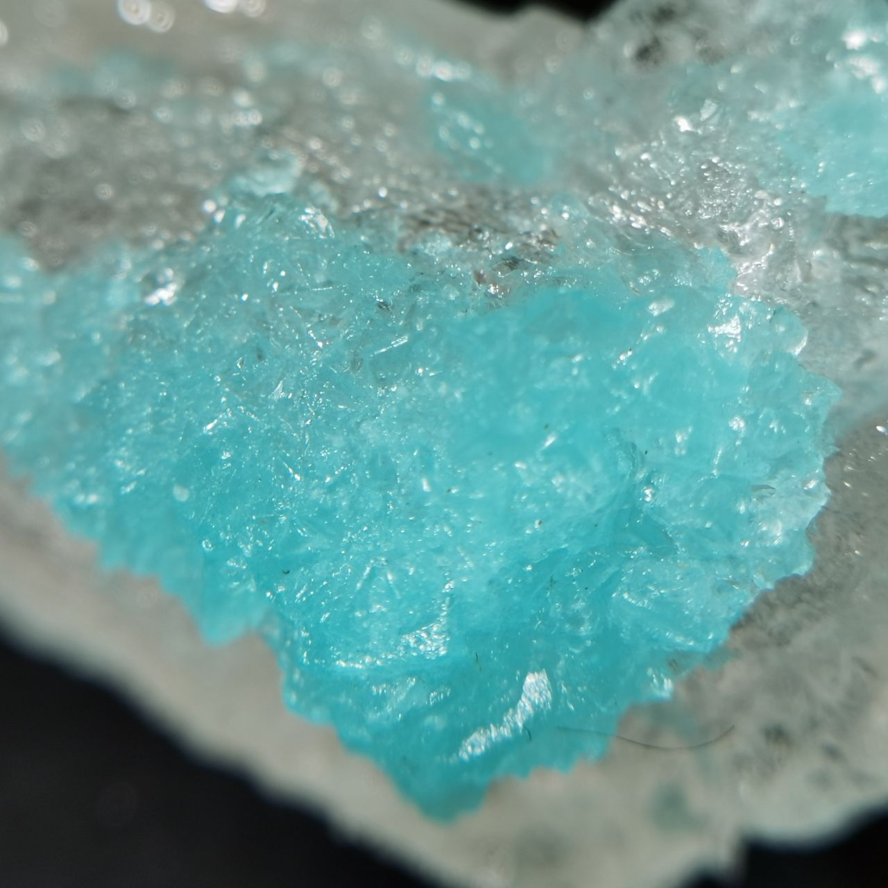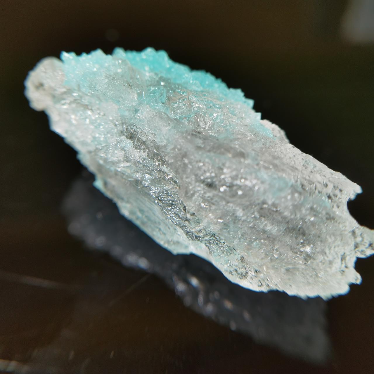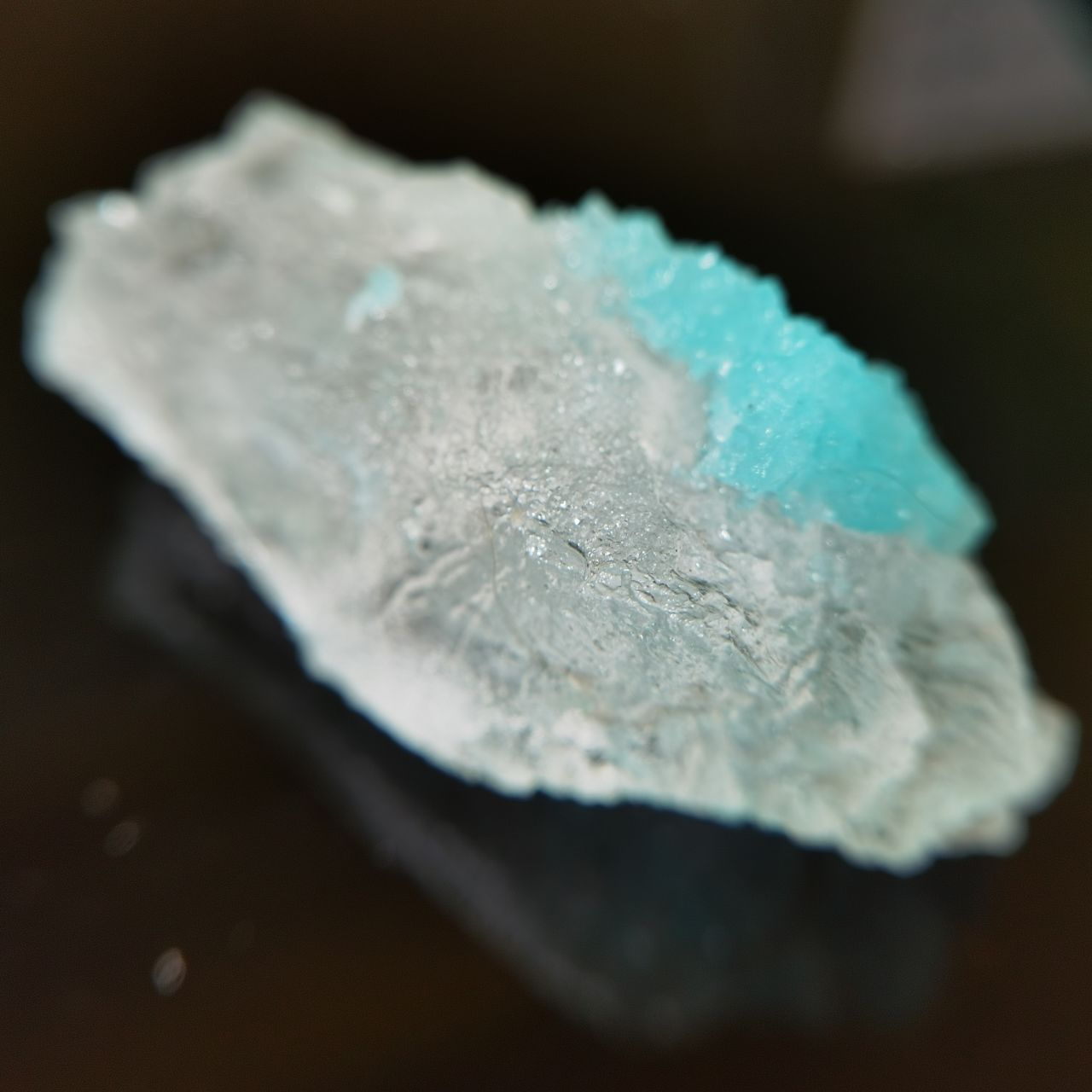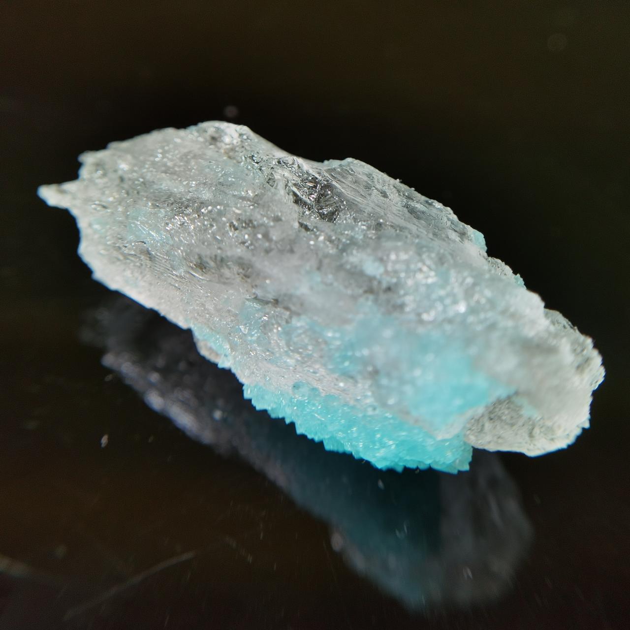 本块标本的卤砂仅为一点点点缀生长在钠铵矾上,画龙点睛,钠铵矾整体半透明,可以从背面看到卤砂蓝色的折射,反光效果也很好,非常出图。卤素矿物一直是我所钟爱的,虽然这些矿物往往娇气,各式各样的盐我之前都收了不少之前也都介绍过,奈何很多东西自然界太难寻找,能够获得这样的slag也是某次上班偶然看见火烈鸟老师的🐟上新,感觉非常幸运了。