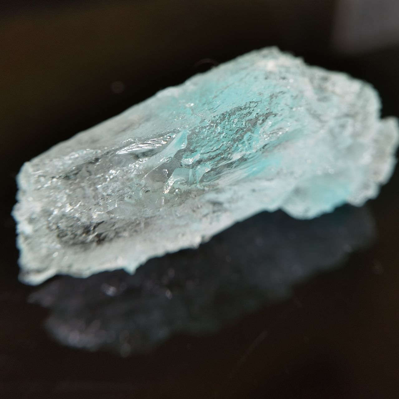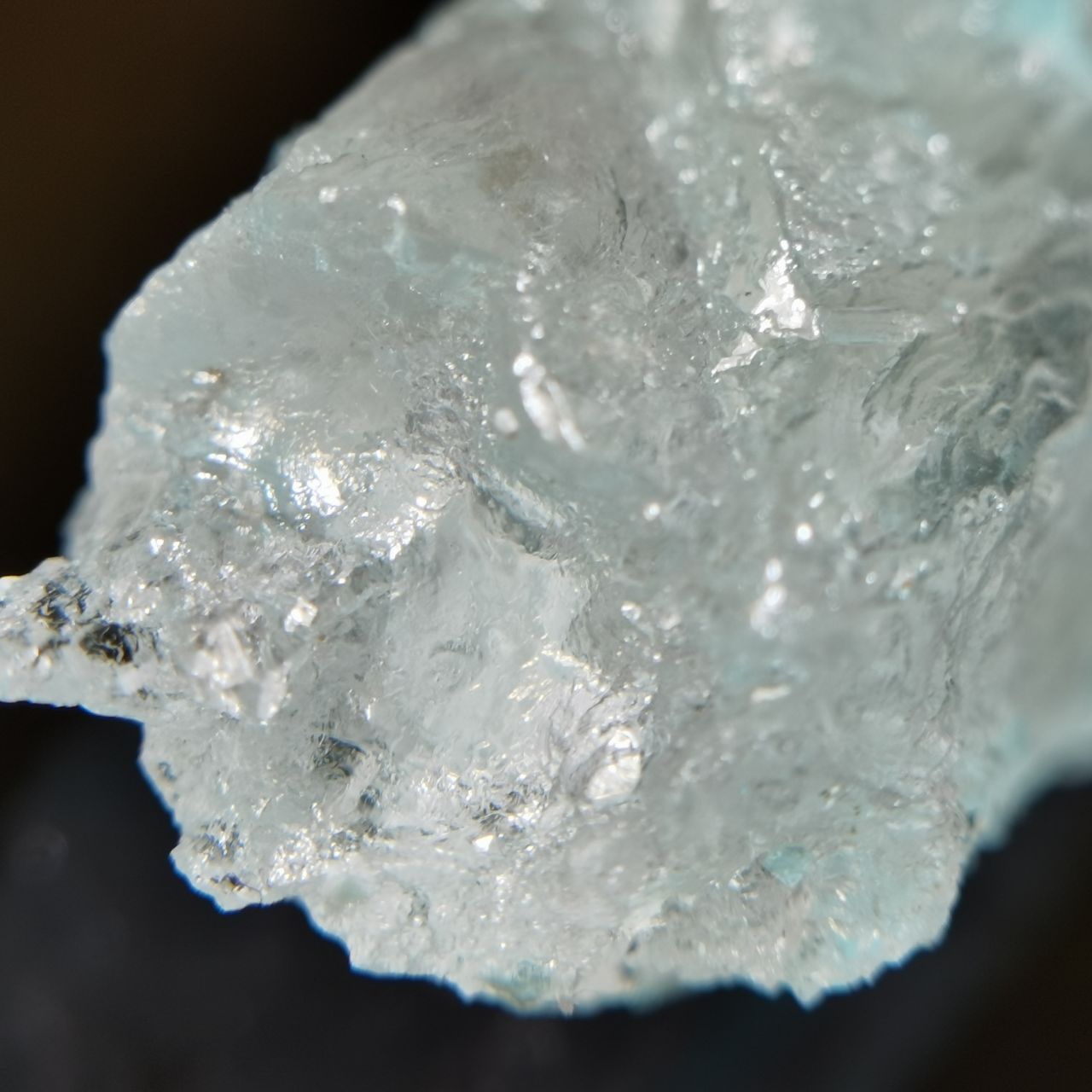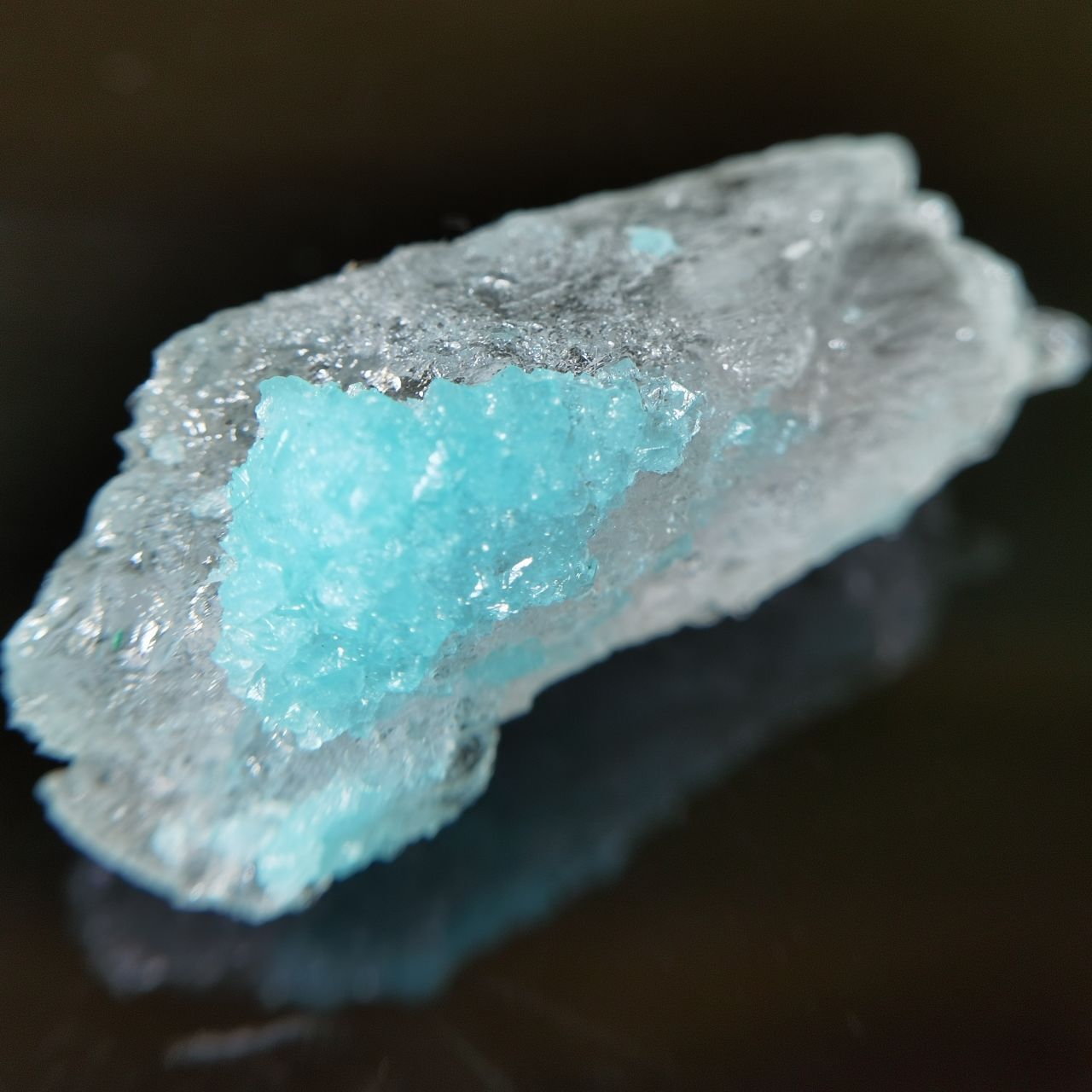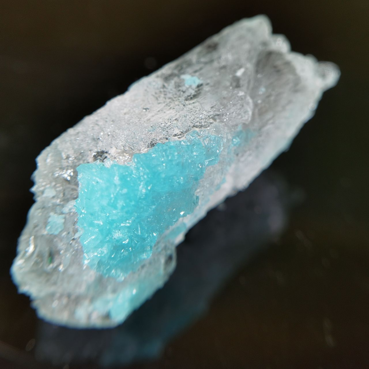 本块标本的卤砂仅为一点点点缀生长在钠铵矾上,画龙点睛,钠铵矾整体半透明,可以从背面看到卤砂蓝色的折射,反光效果也很好,非常出图。卤素矿物一直是我所钟爱的,虽然这些矿物往往娇气,各式各样的盐我之前都收了不少之前也都介绍过,奈何很多东西自然界太难寻找,能够获得这样的slag也是某次上班偶然看见火烈鸟老师的🐟上新,感觉非常幸运了。