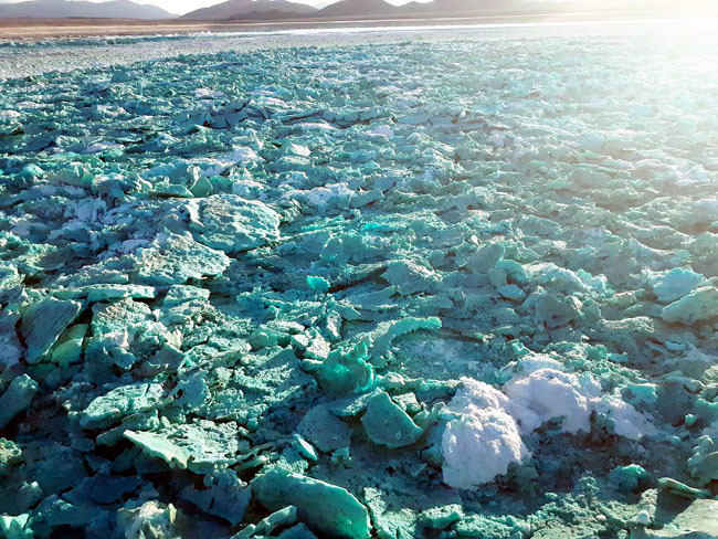 在排除了火山,鸟粪,炸药等不切实际的推测后,这里最有可能是一片铜矿氨浸法的工业处理池,残留的高浓度氨水原本属于工业废液,在干燥的沙漠中晾干这些废液显然比排入海洋要强,结果这些废液里居然长出了美丽的晶体,不可思议。