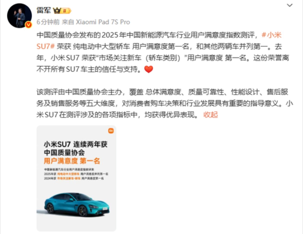 中國質量協會今日發佈2025年新能源汽車行業用戶滿意度指數測評結果。小米集團創始人雷軍隨後在社交媒體宣佈,小米SU7在“純電動中大型轎車”細分市場中用戶滿意度位居榜首,與寶馬i5、極氪001並列第一。