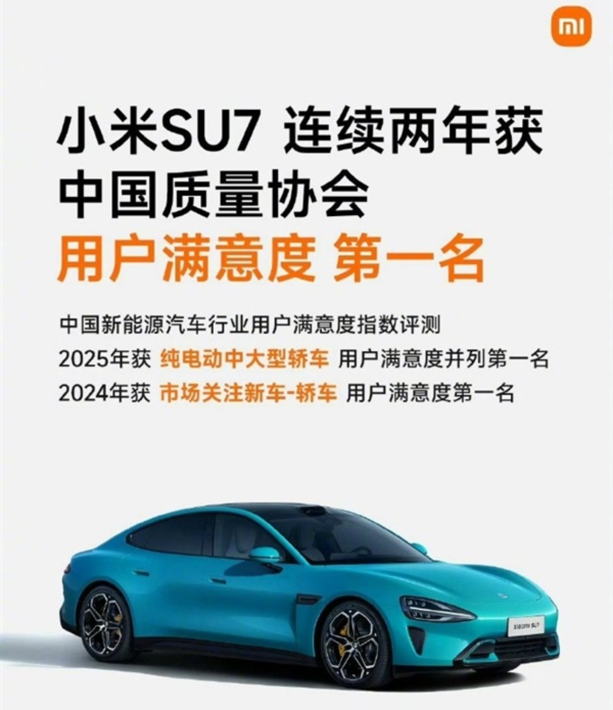 這是小米SU7繼2024年獲得“市場關注新車(轎車類別)”用戶滿意度第一名後,連續第二年在這一權威測評中登頂。該測評覆蓋總體滿意度、質量可靠性、性能設計、售後及銷售服務五大核心維度,小米SU7在各指標中均表現優異。測評結果顯示,小米SU7的用戶滿意度得分爲82分,與華晨寶馬i5、極氪001同分。比亞迪漢EV、小鵬P7+等車型緊隨其後。自2024年3月上市以來,小米SU7市場表現突出,截至2025年12月初累計交付量已突破50萬輛,成爲新勢力品牌中交付規模增長最快的車型之一。