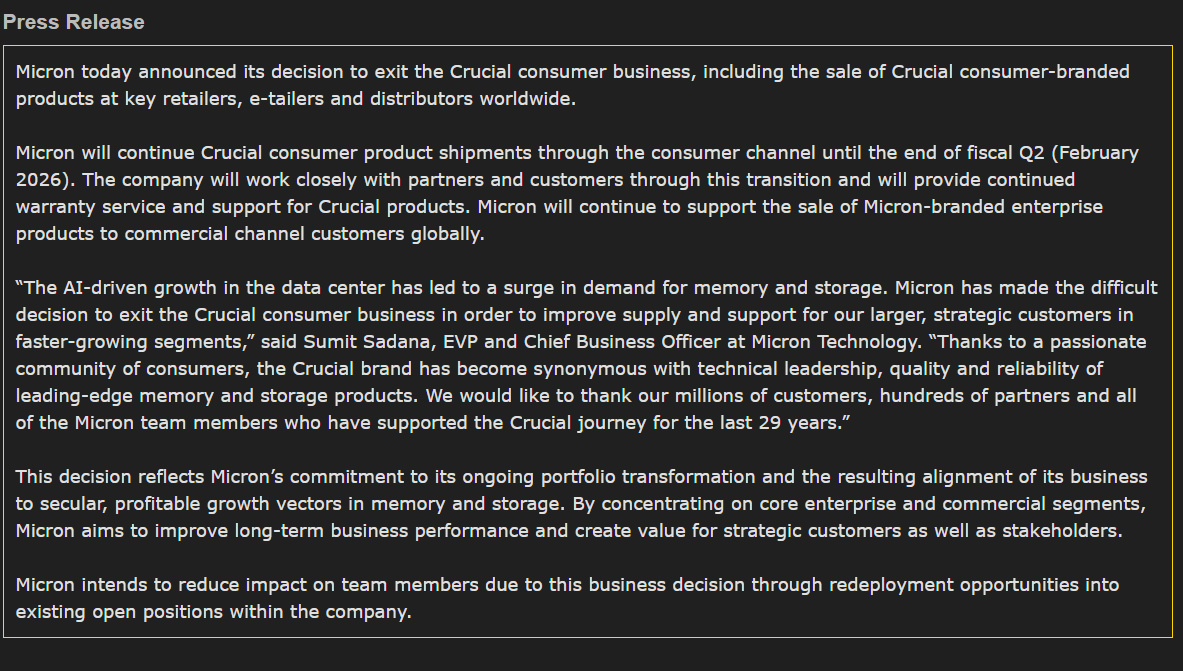 公告内容称:“在数据中心人工智能增长的驱动下,带来了对内存和存储的需求激增。镁光做出了艰难决定,即退出 Crucial消费业务,以改善我们在快速增长细分市场中,对更大战略客户的供应和支持,”