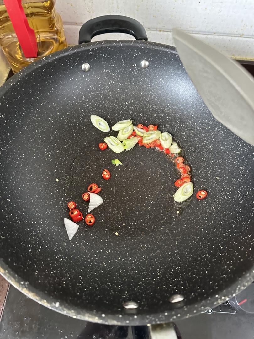 3.起锅烧油加入葱蒜辣椒(蒜忘了买就没放)不许说话
