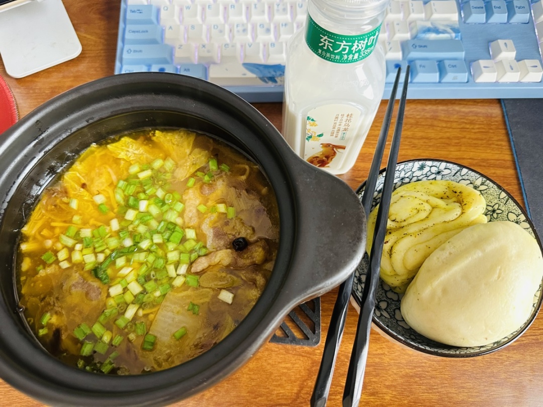 5.加入浓汤宝煮的汤(没有高汤的可以这么做,根据你的量制作一人份半个就够了)煮开加入煮好的配菜,倒入白醋我还加了藤椒油加不加都可以