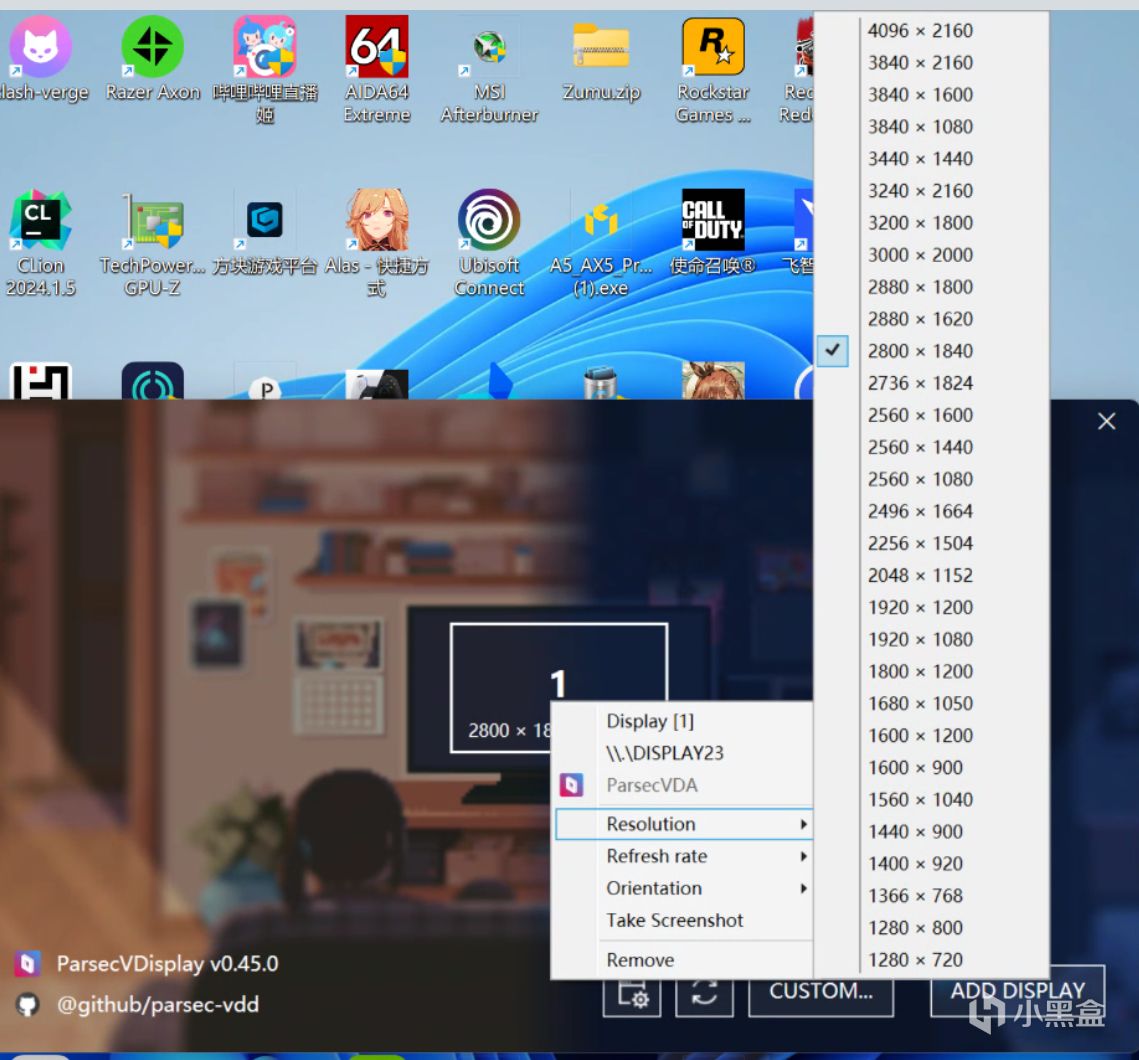 然后点击add display,就创建一个虚拟屏了,不过默认添加的是1080p,在虚拟的显示屏图标上右键选择resolution可以看到一长串分辨率,在里面找到你添加的分辨率然后选择即可。