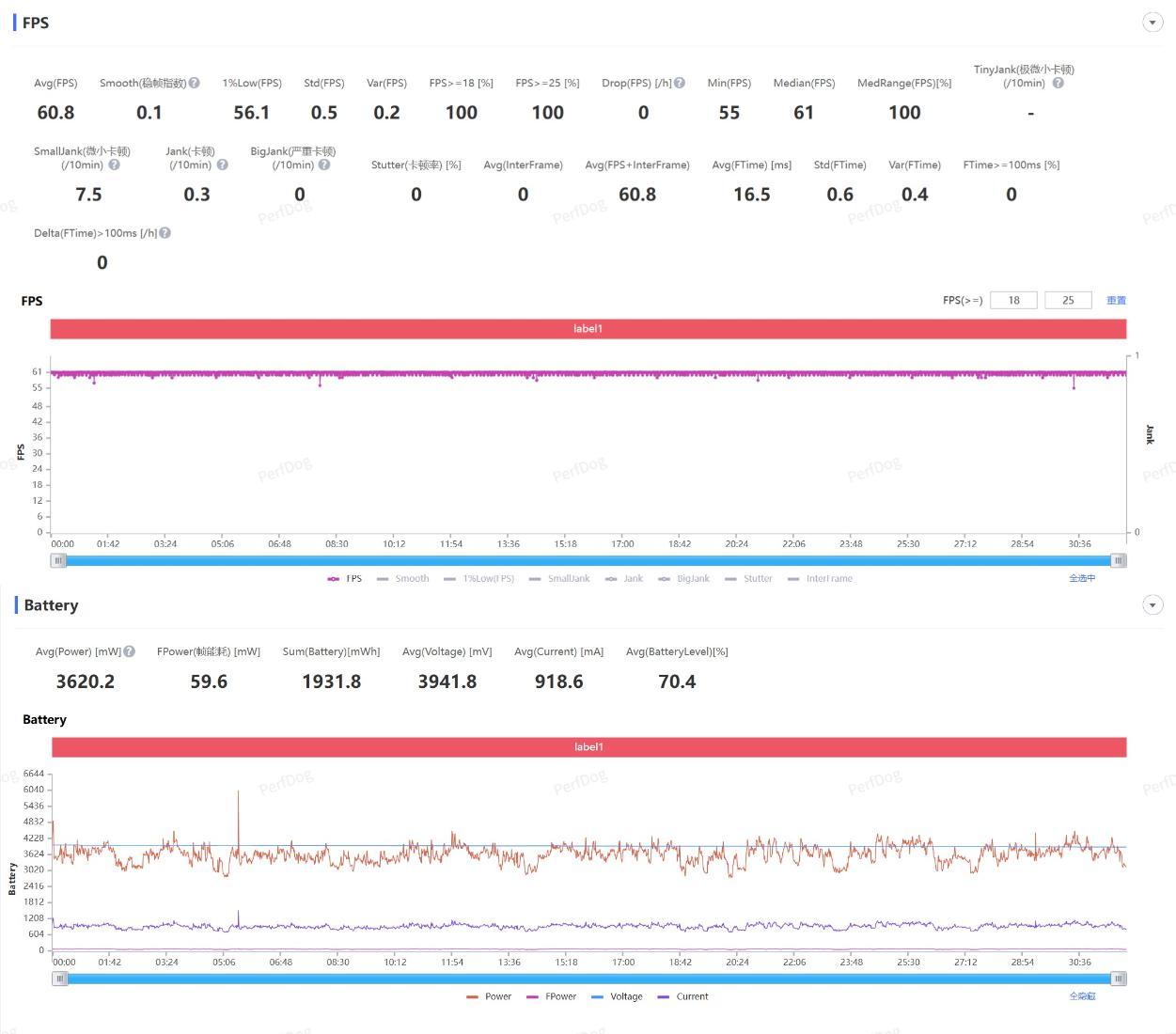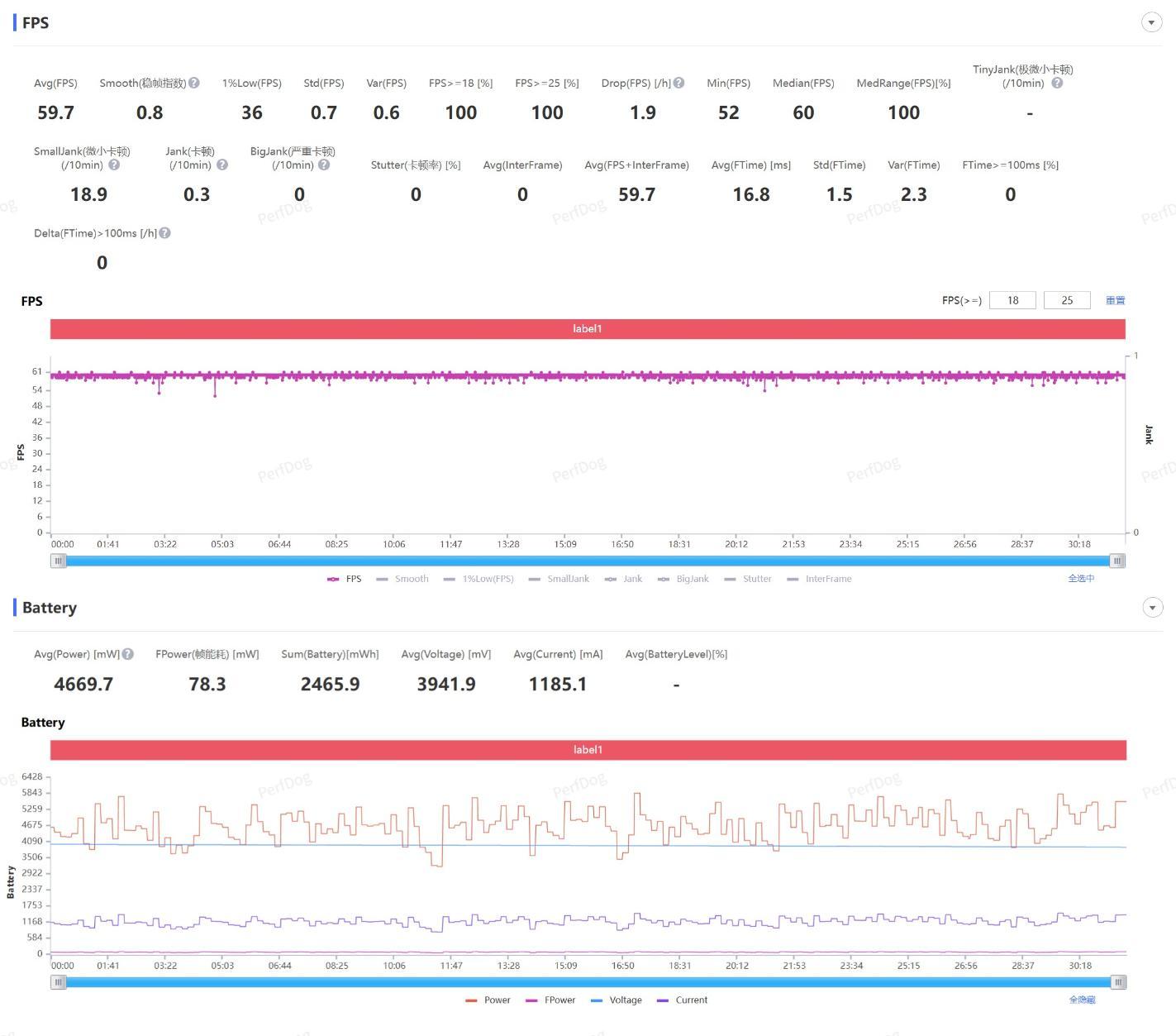 测试结束后,一加 Ace 6T的平均帧为59.7帧,1%Low帧36帧,平均功耗4.6W,压力虽大,但没有明显的帧率波动。
