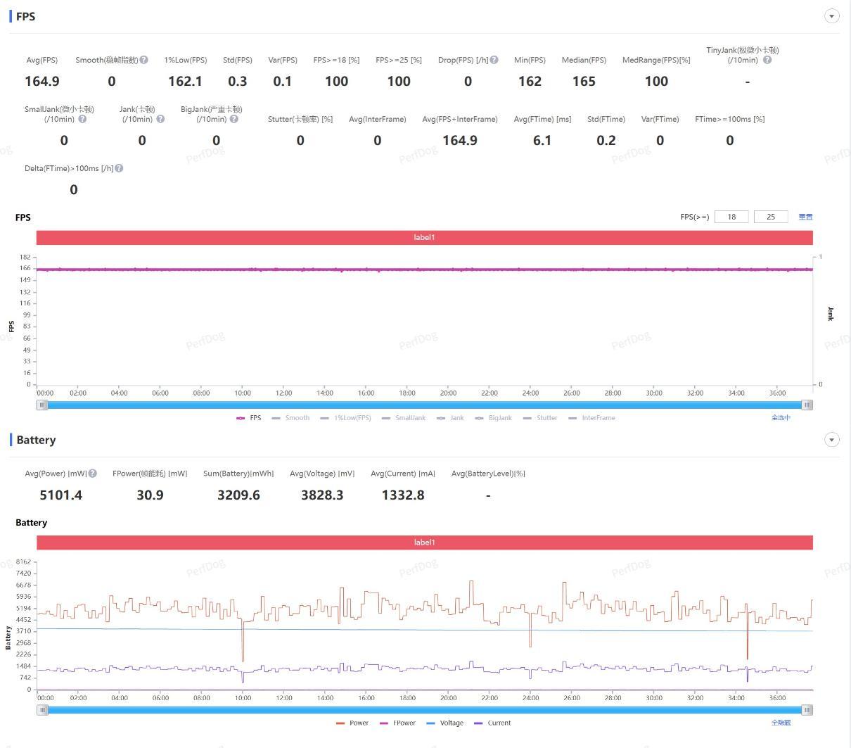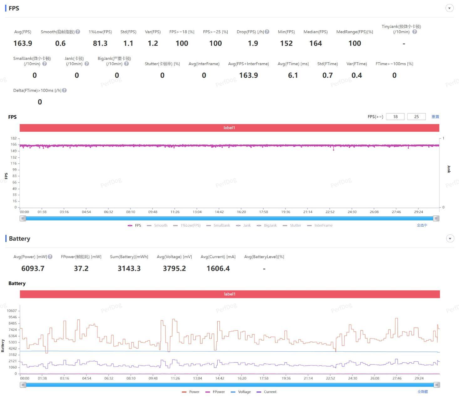 作为首发支持《和平精英》原生165Hz高刷新率模式的机型,一加 Ace 6T的表现丝毫不令人失望,平均帧数为163.9帧,1%Low帧81.3帧,平均功耗为6W,全程帧数稳定,没有出现明显的掉帧卡顿等问题。