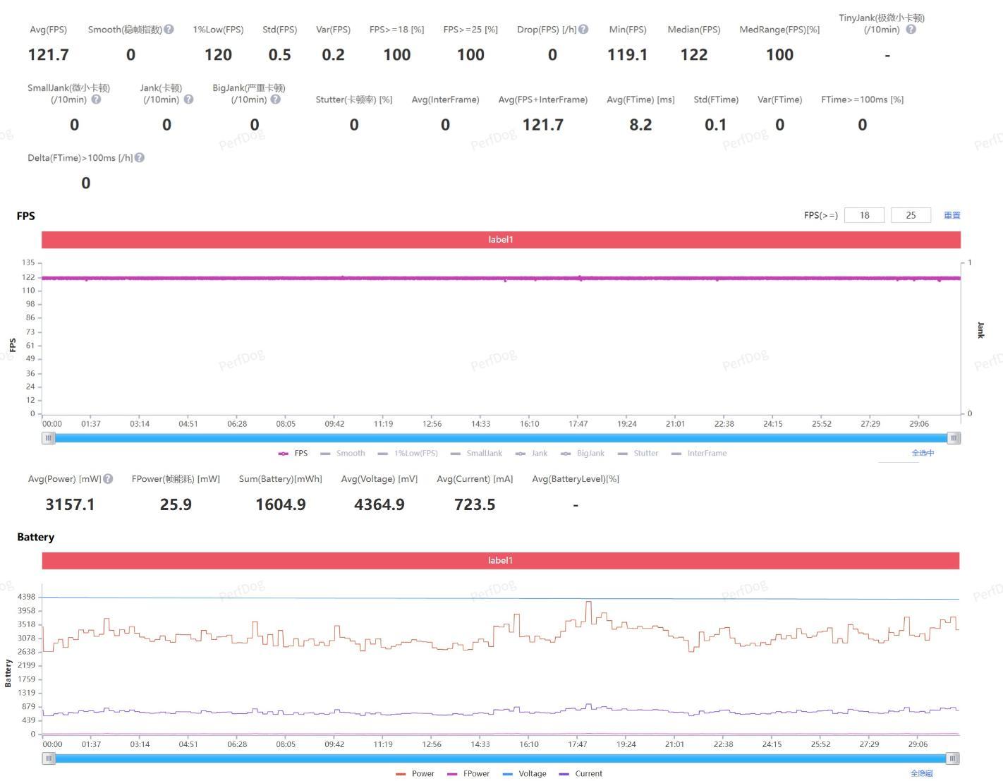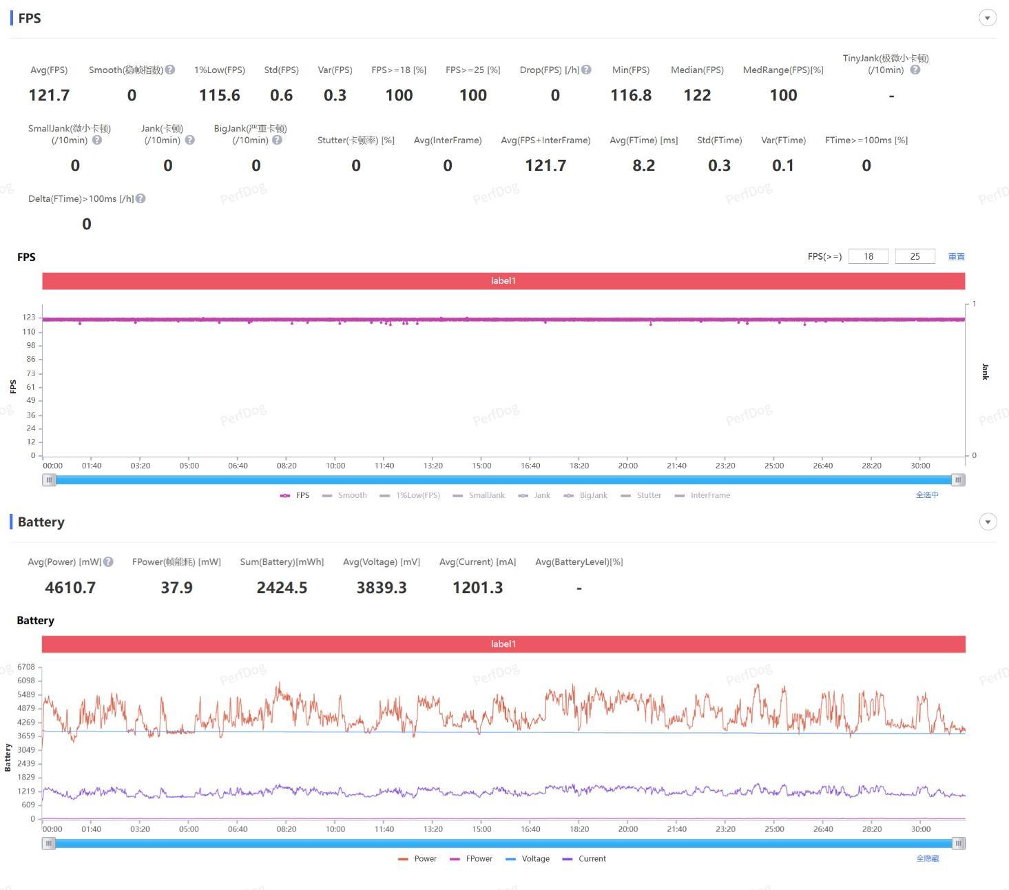 30分钟《王者荣耀》测试结束后,一加 Ace 6T平均帧121.7帧,1%Low帧120帧,平均功耗3.1W,全程帧率稳成直线,毫无压力。