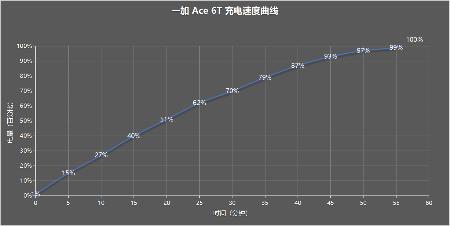依旧是在室温24℃±1℃的环境下,使用原装充电器,从1%开始为一加 Ace 6T充电,并记录数据如下: