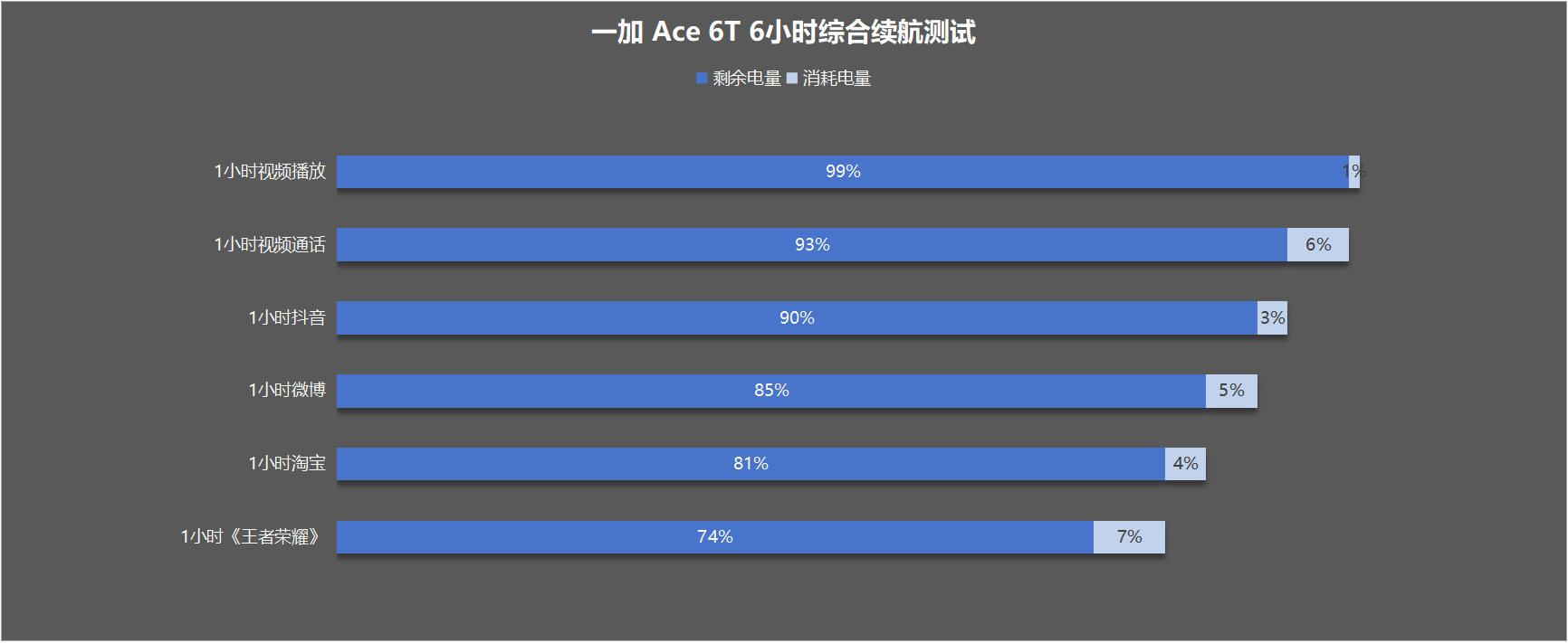 在室温24℃±1℃,且满电状态下进行安兔兔6小时综合续航测试,一加 Ace 6T播放1小时4K视频,耗电1%;进行1小时微信视频通话,耗电6%;播放1小时抖音视频,耗电3%;浏览1小时微博,耗电5%;浏览1小时淘宝,耗电4%,进行1小时《王者荣耀》游戏,耗电7%。