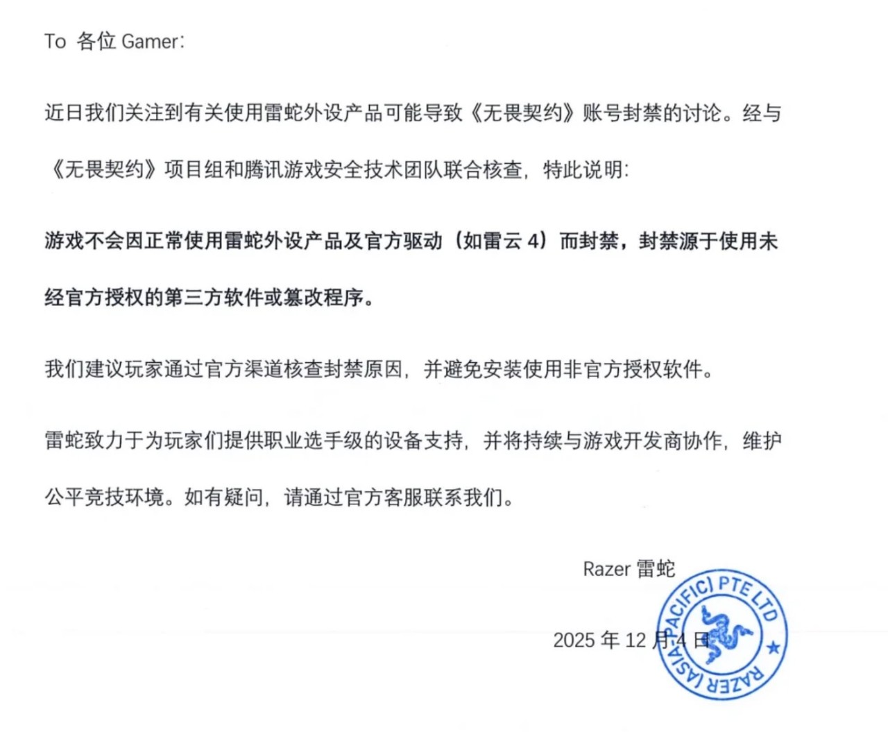 经与《无畏契约》项目组@无畏契约 和腾讯游戏安全技术团队联合核查,特此说明: 游戏不会因正常使用雷蛇外设产品及官方驱动(如雷云4)而封禁,封禁源于使用未经官方授权的第三方软件或篡改程序。