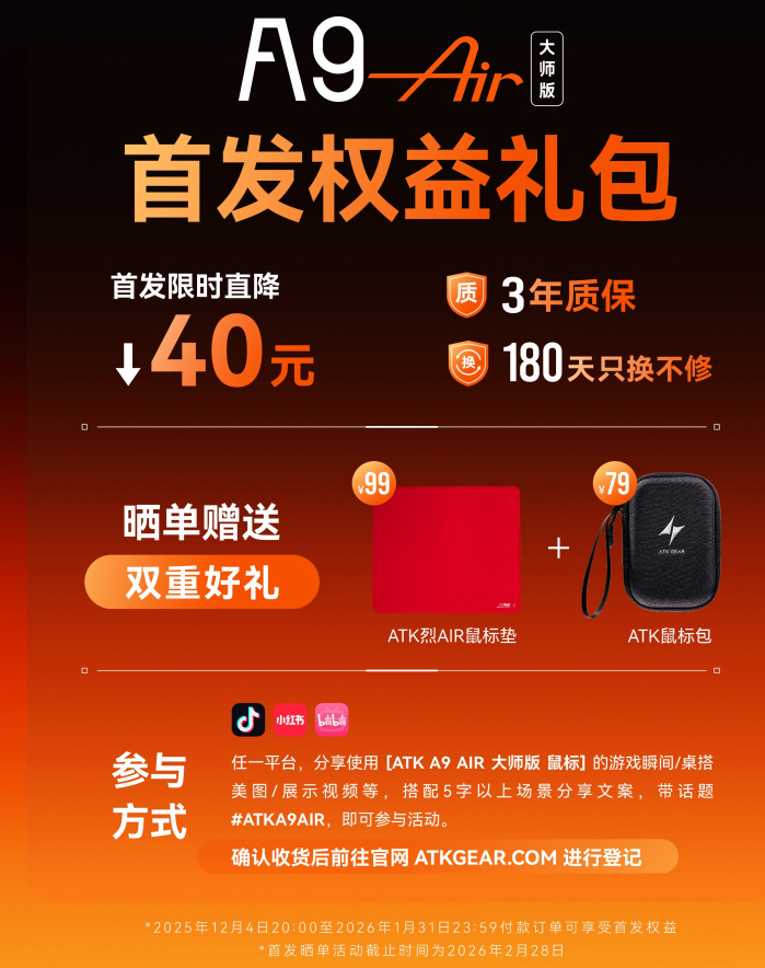 没有额外的首发福利,就是在抖,红,B晒单送定制鼠标包,随便咔咔拍几张图,说个“这鼠标太爽啦”“我太喜欢这鼠标了”之类的骚话,呱呱一顿分享,马上就整个鼠标包,这不嘎嘎香?!