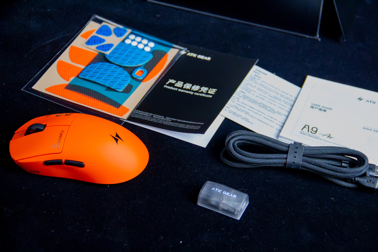 配件方面,除了鼠标和接收器,还有一根伞绳线,一个还不错的橙色的菱形咬纹的全包防滑贴。以及四套脚贴:两套是原装的大脚贴(大货出厂不带脚贴,可自由选择),一套是小脚贴,还有一组小圆点。