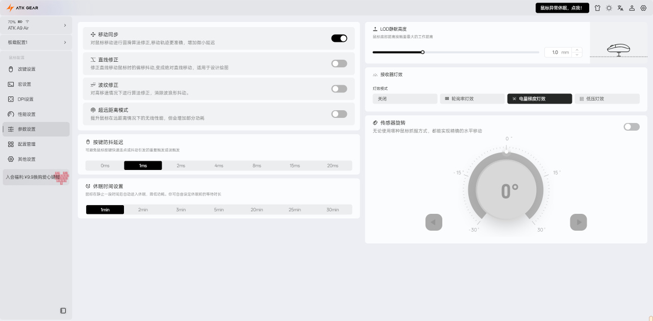驱动方面,没啥好说的,今年ATK的驱动做了优化,我很喜欢。 尤其是美术风格和UI设计,是目前国产品牌里非常强的水平了。 该有的功能也都有,我觉得下一步可能是不同外设之间的联动了 这个名字强烈建议改一下,分明是ATK A9 Air 大师版,没有大师版总觉得差点意思。