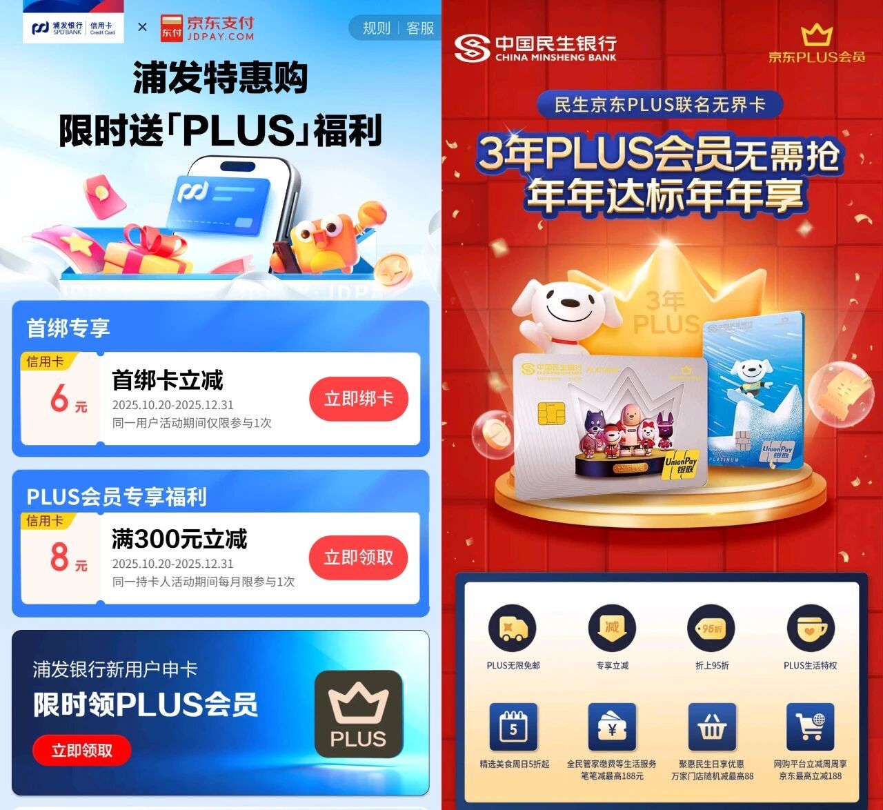 首绑浦发信用卡可享立减6元及满300减8元,新用户申卡可领取PLUS会员、购物返3%(累积360元/年)等。另外,通过京东申领民生信用卡,可送1年PLUS会员加达标2年。