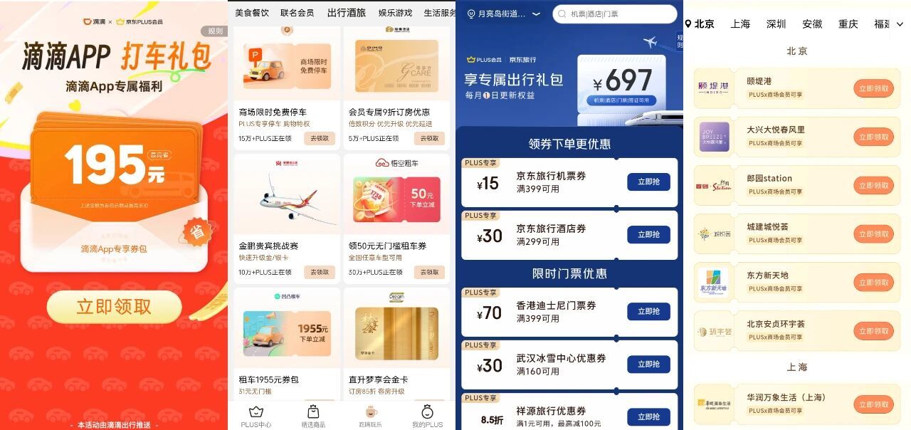日常出行打车可以领取128元花小猪/190元滴滴出行打车券包,长途差旅可以领机票、酒店折扣,有一个397元PLUS专属出行券包。另外还有万达、美高梅、建发等酒店金卡、部分地区部分商场免费停车券(不需要购物)。