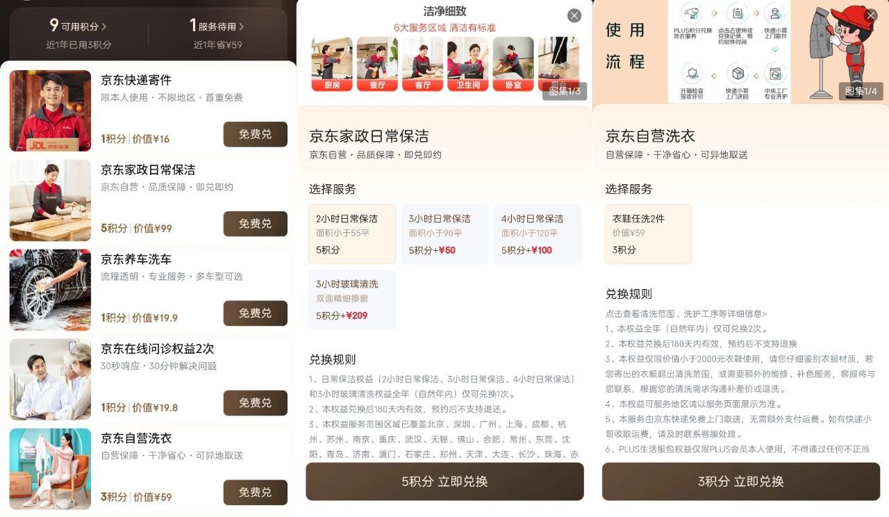 用PLUS积分即可兑换快递、洗衣、家政、养车洗车、京东读书VIP卡等权益,不同权益所需积分不一样,比如3积分可以兑换两件衣鞋任洗1次、1积分可以兑换1次快递免首重、5积分兑换1次上门保洁。