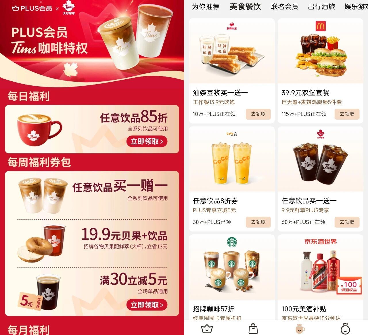 这里面可以领取一些餐饮美食特权,比如Tims咖啡85折、买一送一、特价套餐等。另外还有CoCo、星巴克、永和、麦当劳、瑞幸等品牌的买一送一、折扣、特价、半价福利,上班族日常刷一下点个附近的下午茶挺不错。