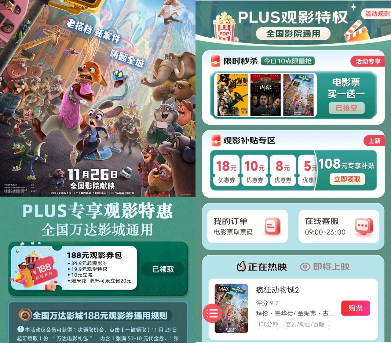 188元万达影城观影券包,全国通用,包含34.9元观影券、双人餐立减20元券、满50减10元券等,领取比较容易。另外还有PLUS观影特权,电影票买一送一(需要每天10点抢)及108元专享补贴。
