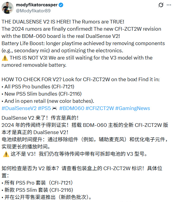 据改装技师Modyfikator89在X平台披露,新款DualSense手柄(型号CFI-ZCT2W)通过硬件改版显著延长续航。该版本搭载BDM-060主板,通过移除辅助麦克风等组件并优化电路设计实现更持久续航能力。