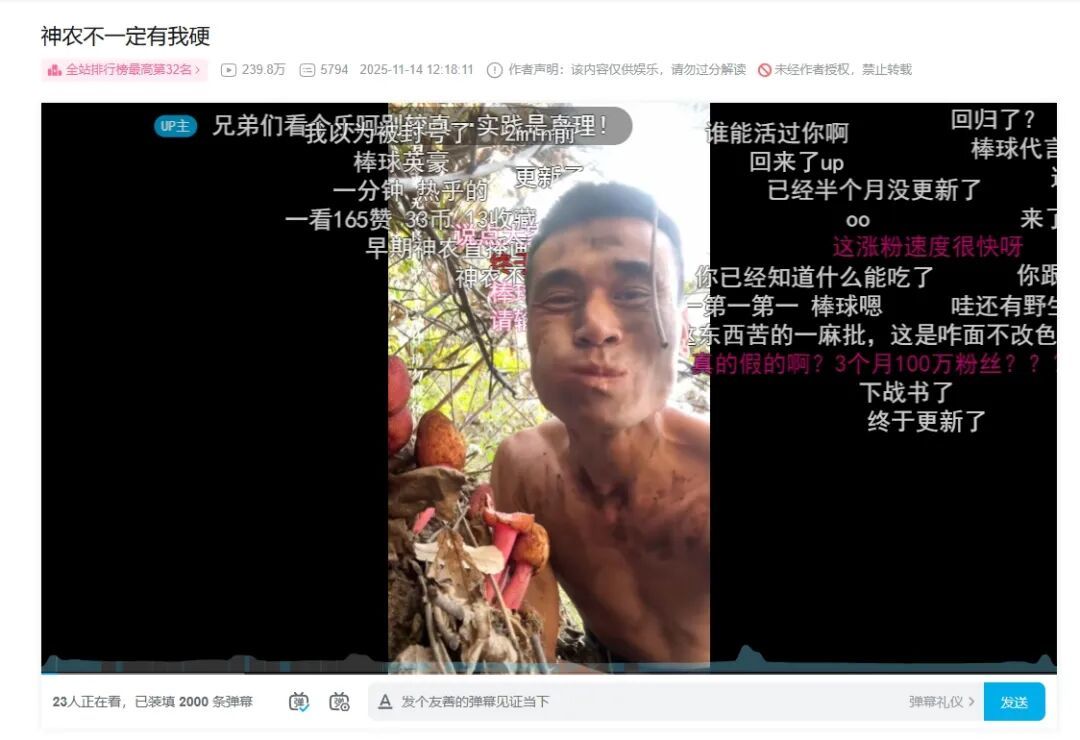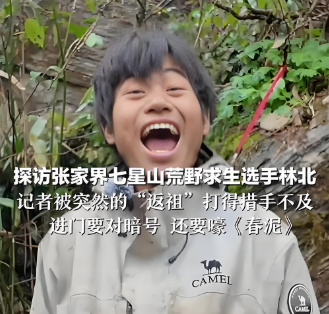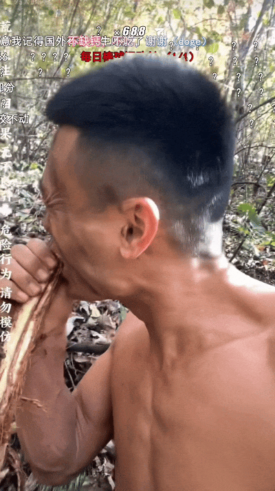 比如中医专业毕业的00后“林北”,靠着一张展现阳光笑容的照片出圈。也许是因为无聊久了物极必反,又或者是吃了发酵的猕猴桃有点酒精上头,这哥们儿的精神始终处在一种比较“癫”的状态,要么爬上枝头学狒狒乱叫,要么就连砍三十几棵树做柴火,作势要和对手熬到底。