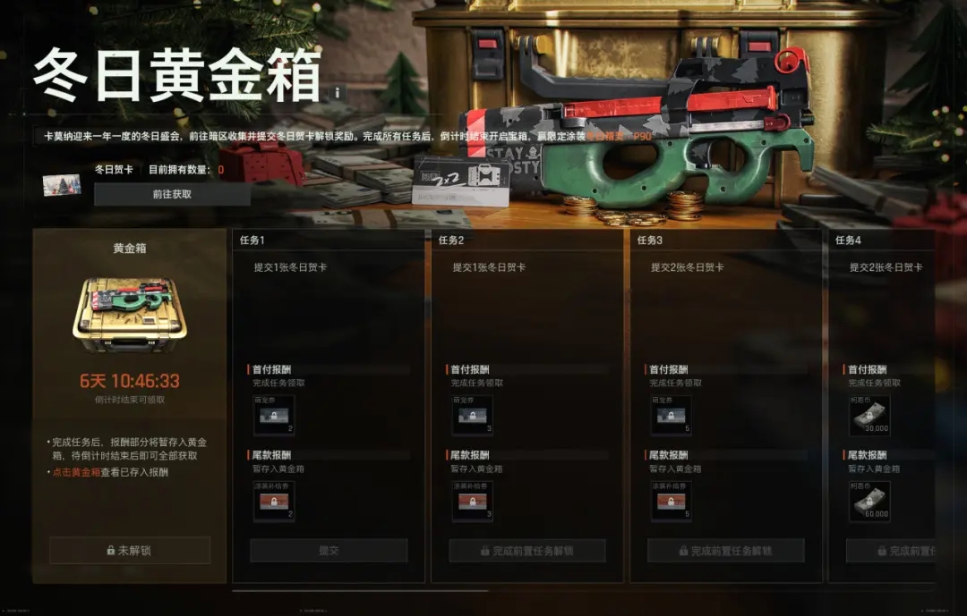 12月5日起,前往暗区收集并提交冬日贺卡解锁奖励。完成任务后,可领取首付报酬,尾款报酬将暂存入黄金箱,倒计时结束后即可获取全部奖励,包含:【冬日精灵·P90微型冲锋枪】、7天基础会员卡、萌宠券、涂装补给券、大量柯恩币等丰厚奖励。