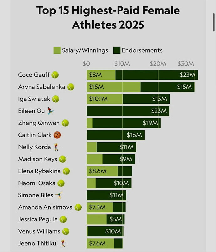 著名体育财经媒体Sportico公布了2025年度全球女运动员收入排行榜,美国一姐高芙以3100万美元(800万奖金+2300万场外)高居榜首。