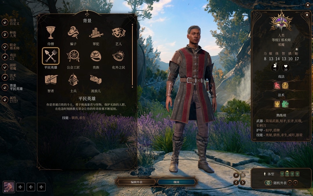 • 背景:提供初始技能熟练度和背景故事,如"贵族"提供社交技能,"流浪儿"提供生存技能