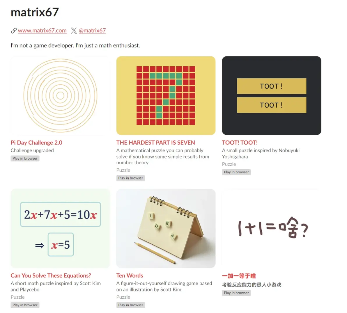 Artless: 比如說 Matrix 67 就是寫數學博客那個,他也做過些不錯的小遊戲。這就是很好的例子——一個有別的主業的人做遊戲的效果。
