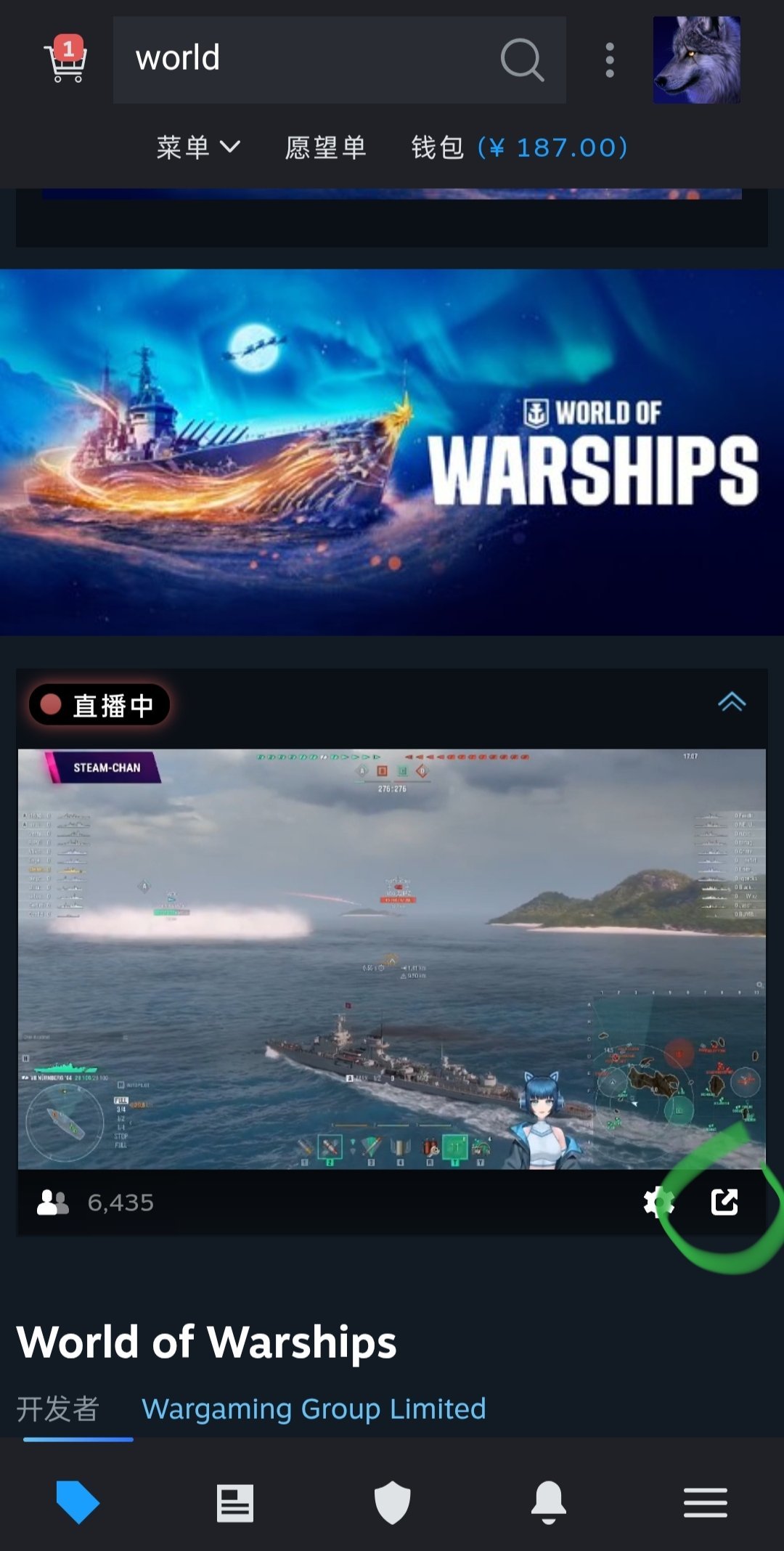 首先搜索战舰世界的英文名,直接搜world就可以看到了,第一个画圈这个就是了,如果没找到就搜完整的英文名也行