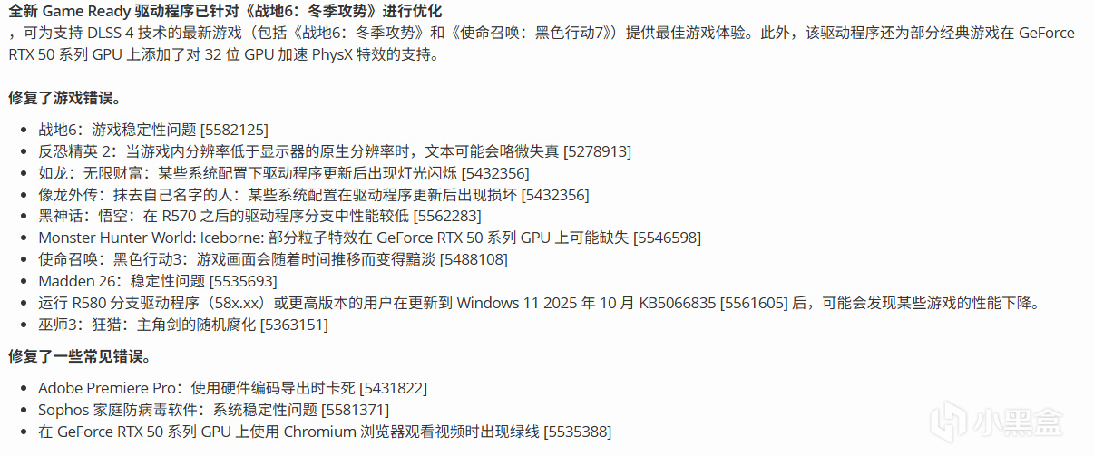 此外,此次更新还修复了 R570 之后分支的《黑神话:悟空》的性能问题,以及 RTX 50 系列显卡上《怪物猎人世界:冰原》粒子特效缺失的问题。同时,《使命召唤:黑色行动 3》中长期存在的屏幕亮度调节问题和《麦登橄榄球 26》的稳定性下降问题也得到了解决。
