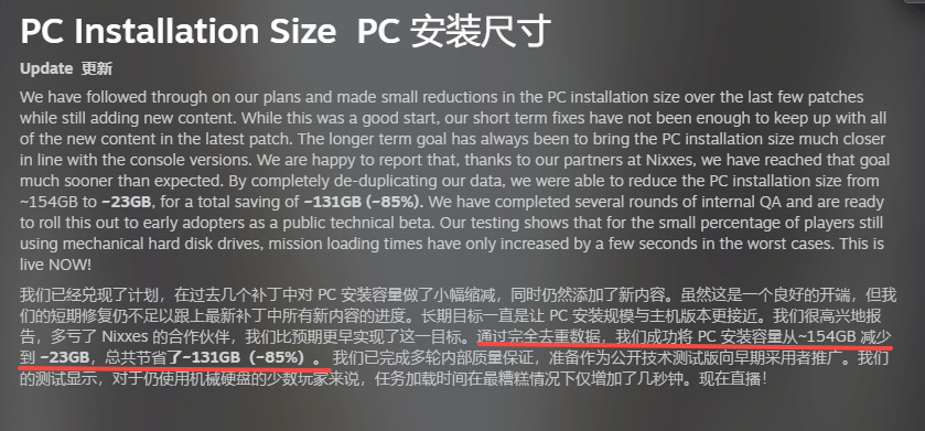 近期,《绝地潜兵2》通过一次大规模技术更新实现了惊人的逆转。12月2日上线的5.0版本将游戏安装体积从原先的152GB大幅缩减至约23GB,狂砍近130GB空间,降幅高达85%。