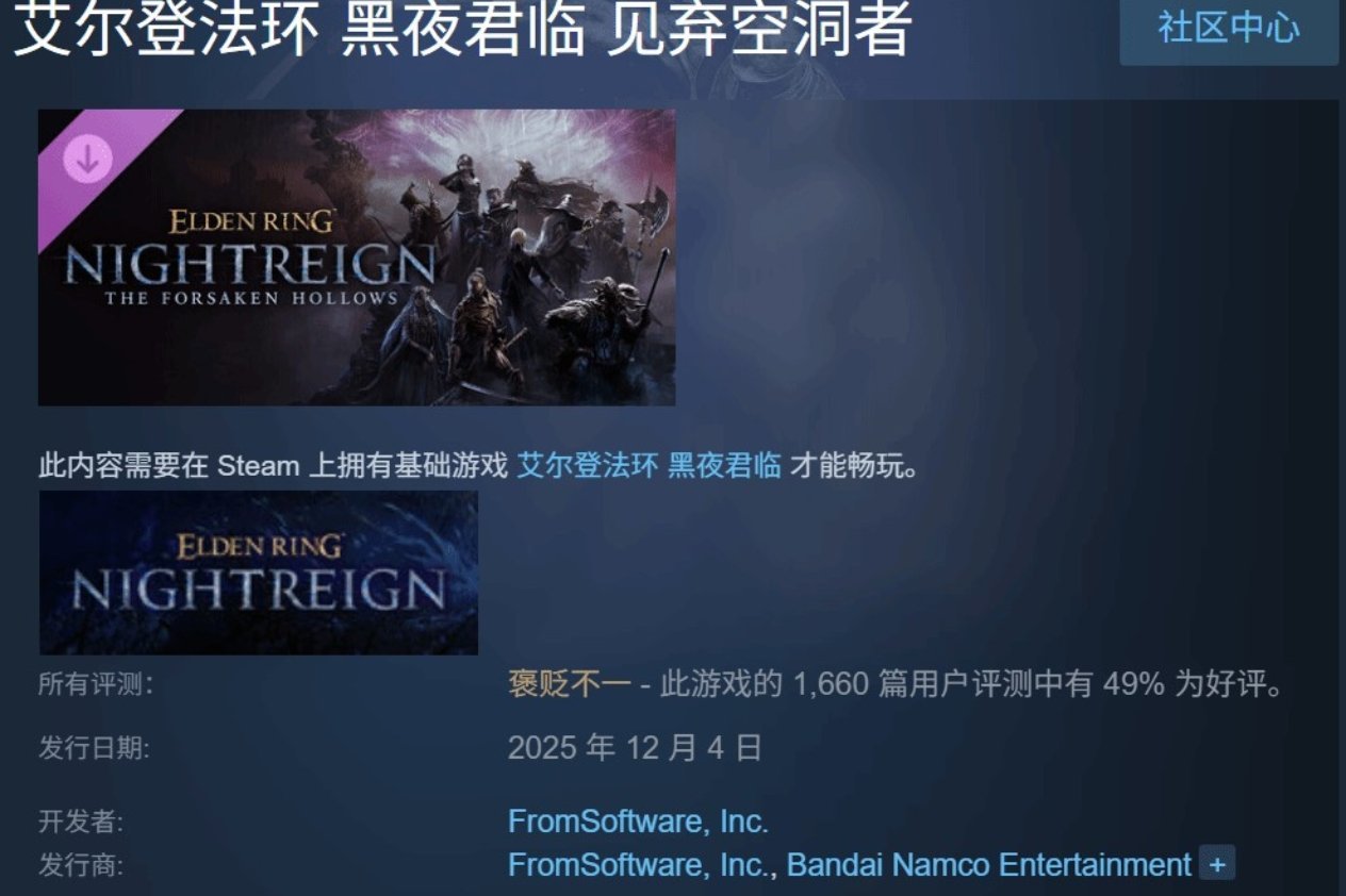 《艾尔登法环:黑夜君临》的首个付费DLC“见弃空洞者”已于近日正式登陆各大平台。然而在Steam上架仅一天后,其好评率急跌至49%,评价状态为“褒贬不一”,创下FromSoftware在Steam平台的历史最低评分纪录。