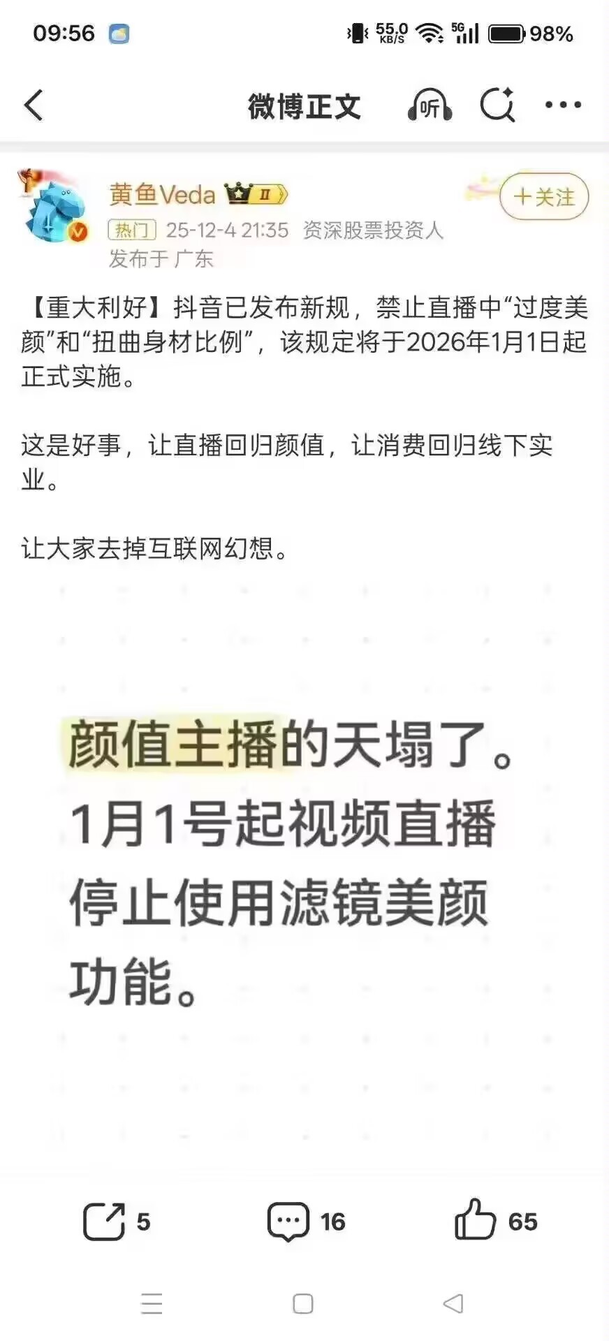 抖音將推出新規,禁止在直播中,使用“過度美顏”“扭曲身材比例”等功能,以求讓身材迴歸身材,所謂清水出芙蓉,天然去雕飾。