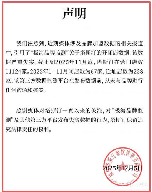 近年来,连锁餐饮品牌的门店变动数据常引发市场关注,第三方监测数据与品牌官方披露存在差异的情况并不少见。。对于 “极海品牌监测” 及其他第三方平台发布失实数据的行为,塔斯汀明确表示将保留追究法律责任的权利。