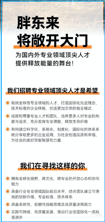 对于人才能力,胖东来提出明确要求,需具备全球化视野,拥有跨文化、跨专业的开放心态与协同能力。在所属行业专业领域达到国际前沿水平,能够结合团队搭建可落地的创新价值体系、专业标准及技术框架。