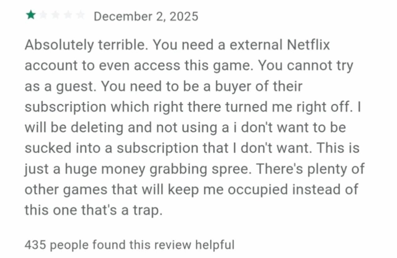 在针对订阅模式的抱怨中,也夹杂着一些关于游戏性能的合理反馈。但核心矛盾在于,如何让玩家清晰理解:拥有Netflix会员资格等于可以免费游玩这款原本需要付费购买的游戏,而非需要额外支付费用。对此你怎么看?