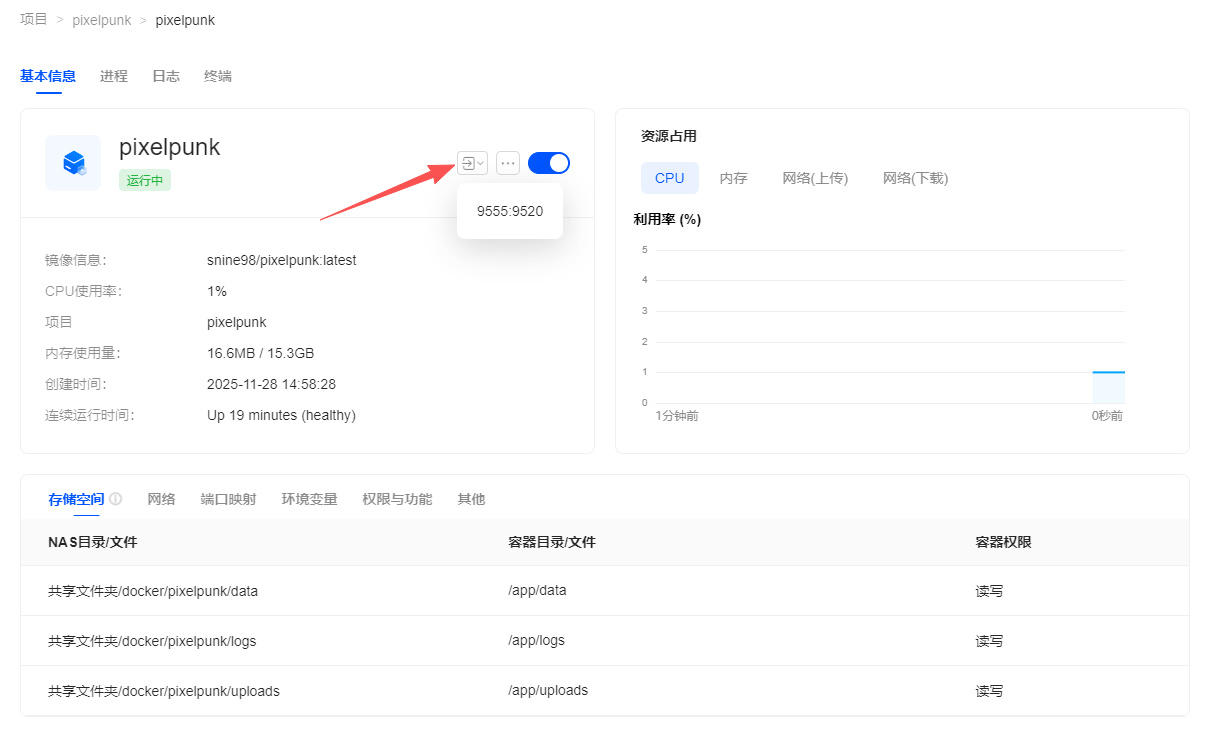 确定所有内容无误之后点击立即部署,NAS会拉取镜像并启动容器,这时候在项目管理中能看到主程序以及附属程序都已经运行成功。