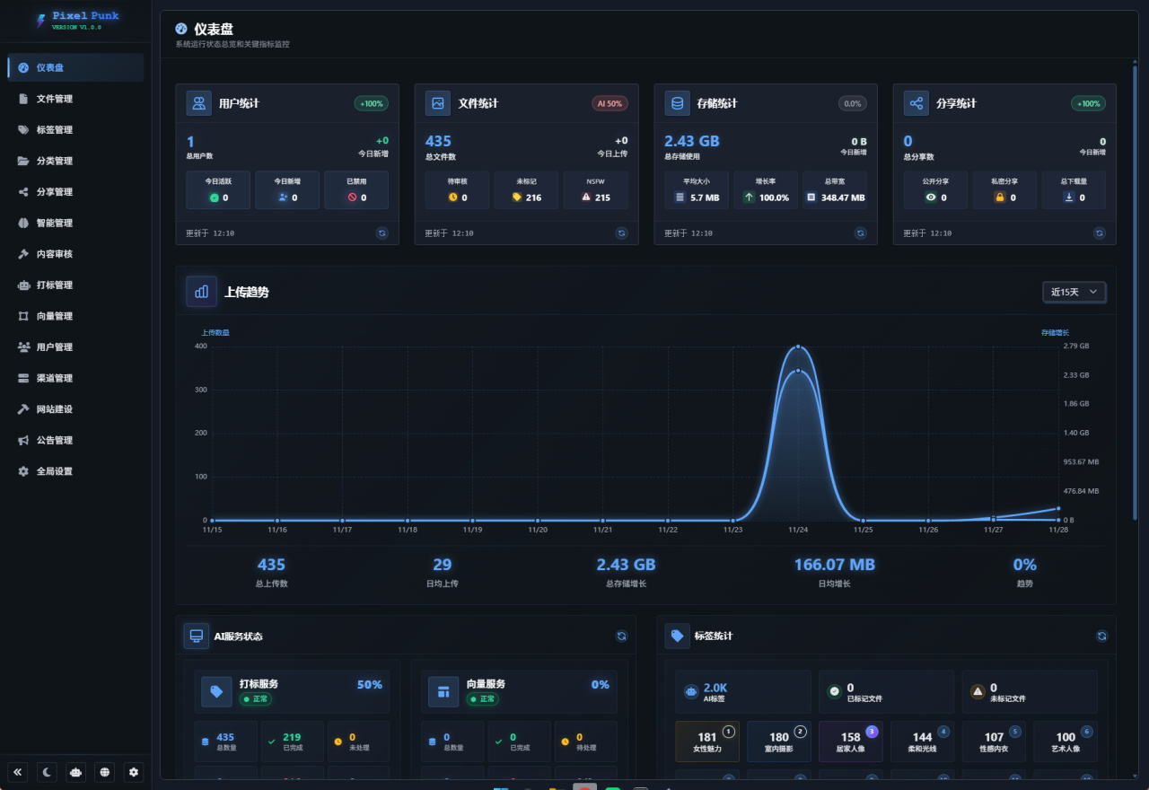 登录后台之后首先看到的是仪表盘,仪表盘会展示用户统计、文件统计、存储统计以及分享统计,同时下方会有上传趋势甚至AI服务和标签统计,能宏观看到整个项目中图片的打标进度和标签数等等。